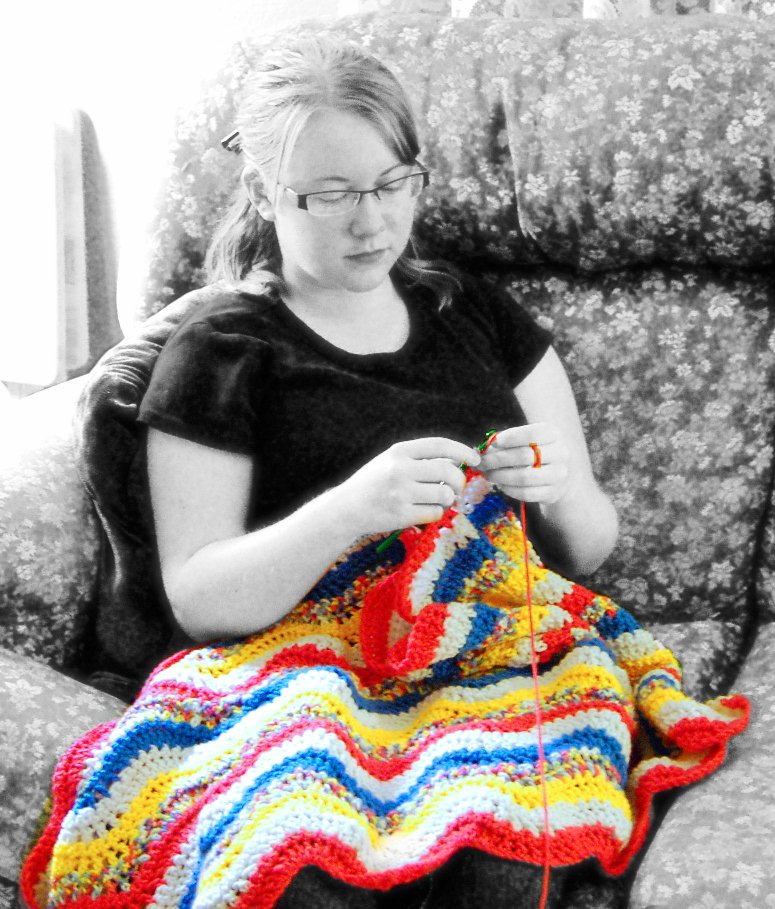 Well, I have taken a break from knitting for a while to crochet a bit, even thought the new knitting method is going well. I’m going to stick with continental knitting (see previous post for more details). I decided to start a ripple afghan for myself after making one for a friend of mine (pictures are still stuck in my camera; I’ll have them up soon), which took me exactly one week and one day to make. I used a size K crochet hook and used the Soft Waves pattern from Jan Eaton’s 200 Ripple Stitches, so it went really fast. I decided to use the Pink Ripple pattern from the same book, which still uses the double crochet, but varies the stitch a bit. I love the colors I picked: pink, blue, yellow, white, and a variegated yarn that has all of the other four colors. My mom got a new camera, so she took a picture of me working on my afghan. She’s kind of mad that I am using the same color scheme for my blanket that she used to make an adorable granny square blanket, but that’s what happens when you shop together. (Love you, mom! See, I said your blanket was adorable.)