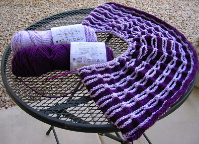 I cast on around 250 stitches to start. After twenty or thirty rows, I decided I didn’t want to make a big miter like this in just the two colors. So, it’s been frogged. I decided to stick with the three small miters I have already.