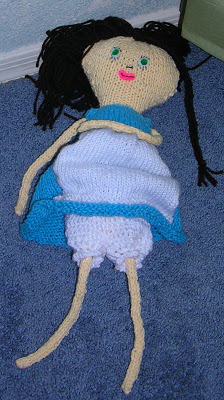 Now for some more technical details: The only disadvantage to making the Princesses was my choice of yarn. I used “Sugar and Cream” cotton in various colors and discovered that I do not like cotton unless mercerized or in a blend. Since I made the Belle doll second, her hair, apron, and pantaloons are made with some acrylic stash I had. The eyes and mouths were made with felt pieces secured to the face with embroidery thread. The cute little arms and legs were i-cords.