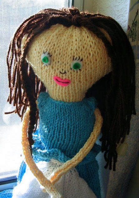 Aside from afghans and shawls, my favorite thing to knit or crochet is stuffed toys, sometimes known as Amigurumi (Japanese for “small crocheted doll”). I previously posted about a mermaid I had knit for my cousin Karee, whose favorite Disney Princess is Ariel. So I naturally had to make a Princess for cousin Khloe, whose favorite Disney Princess is Belle. Here she is waiting at the window, waiting to meet her Prince Charming (or in this case, her Khloe):