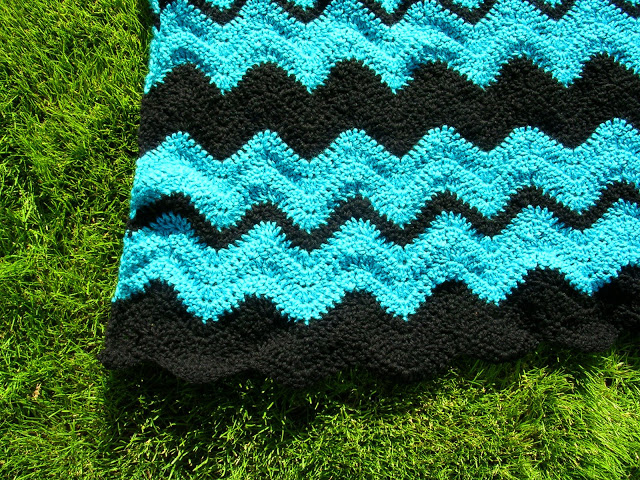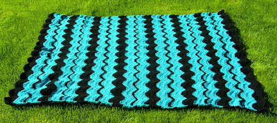 The last blanket pictured is The Blue Mint Ripple. A gal from my poetry class last semester saw me crocheting before class one day and asked me if I would make her one if she paid me. I said yes immediately. When she told me to make it in “turquoise” and black, I was a bit concerned about the color choice. But once I bought the yarn (Caron Simply Soft Brites in “Blue Mint”) I warmed up to the color combo and fell in love with it. The finished blanket ended up being extremely long because the recipient was 6’1″ She was so thrilled to receive this blanket and thought it was perfect. No greater satisfaction can be found than when someone loves what you make.