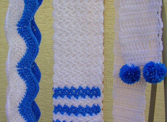 - Knit scarf all in white alternating every 8 rows between garter stitch and stockinette stitch. Single crochet border in blue all the way around scarf.
