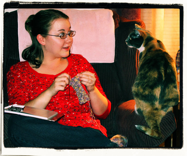 On Christmas Day, we went over to my aunt’s house. She happens to own a very feisty calico cat name Nina. I had brought my new sock project over with me that I started that morning to work on while visiting with family. When Nina saw yarn moving, she instantly came over to investigate: