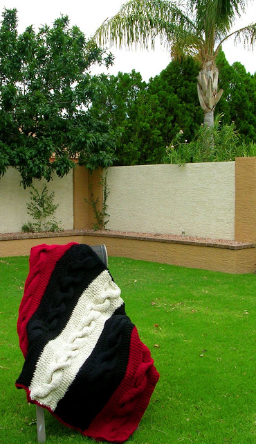 I’m talking about my new favorite pattern, Cable Comfort Throw. I said I made one more with three colors, and here’s how it turned out: