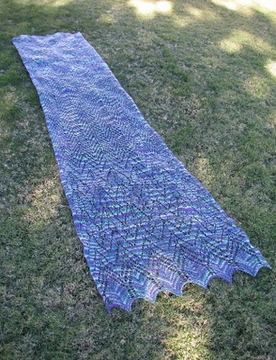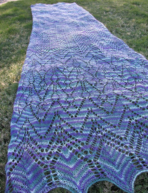 I didn’t think I would have enough floor space in my room to block this mammoth. I don’t have an exact measurement for the shawl, but it’s over 6 feet long. That would seem like too big of a shawl for me (I’m only five foot tall), but it actually is better being longer. I like to wear rectangular shawls wrapped where the two ends drape over either side of the same shoulder, in order to show off the main intricacy of patterning at both ends. And thanks to the fiber content, something so light and airy is also very warm.