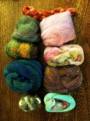 For Day 9 (yesterday) I was able to get the first color on the wheel, a grey shetland that I’m mixing with a mulberry silk to get a marble effect (first picture). I have enough of the cream silk to carry it through most of the darker fibers. The solid colored mini braid in the photo is 100% bamboo that I think I will try to carry through most of the lighter colored fibers. This spinning project is such a fun opportunity to mix and blend. I’m looking forward to seeing what the finished yarn will look like.