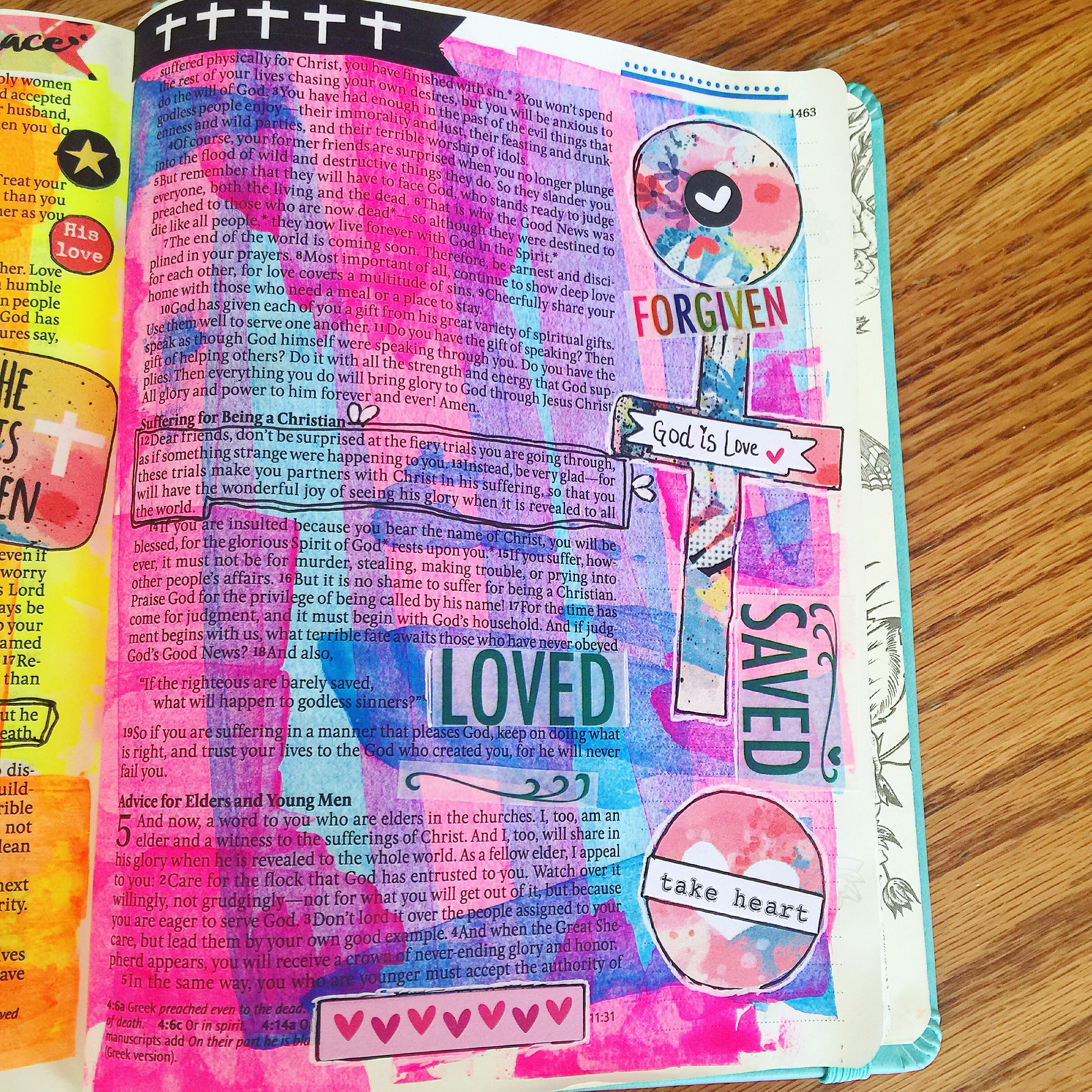1 Peter 4:12-13 “Dear Friends, don’t be surprised at the fiery trials you are going through, as if something strange were happening to you. Instead, be very glad for these trials make you partners with Christ in His suffering, so that you will have the wonderful joy of seeing His glory when it is revealed to all the world.” I love these bright, colorful, vibrant pages to remind me that my joy comes from God, even in the midst of trials, and that Jesus’ work is finished and He lives!
