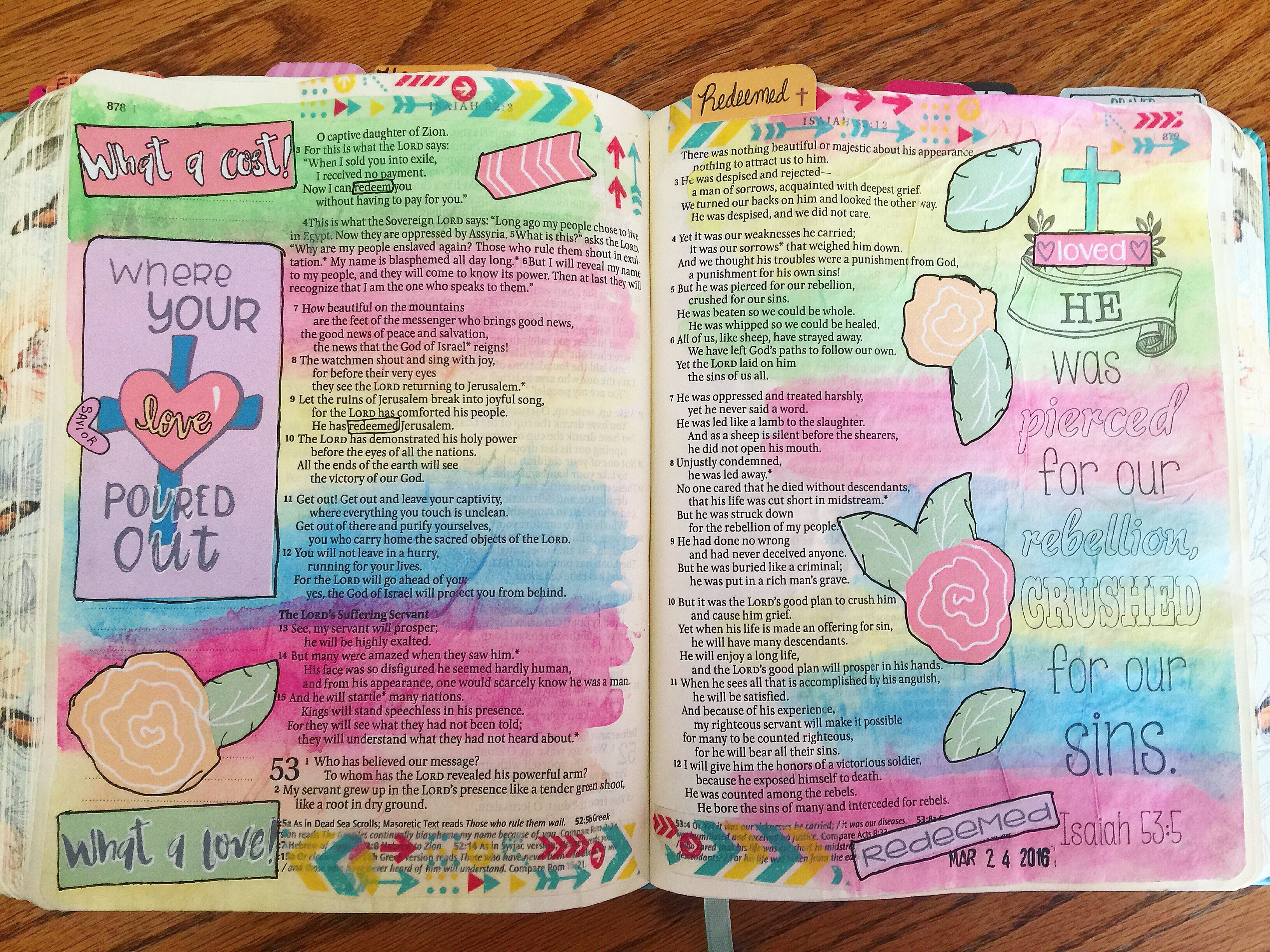 For today, I tried out some new watercolor gel crayons that I found at Target. I was pleased to find that they do not bleed through the pages, even with no prep, so I used them to add all this color. The paint went on really smooth and did not dry chalky. I’m excited to use them again in my Bible.