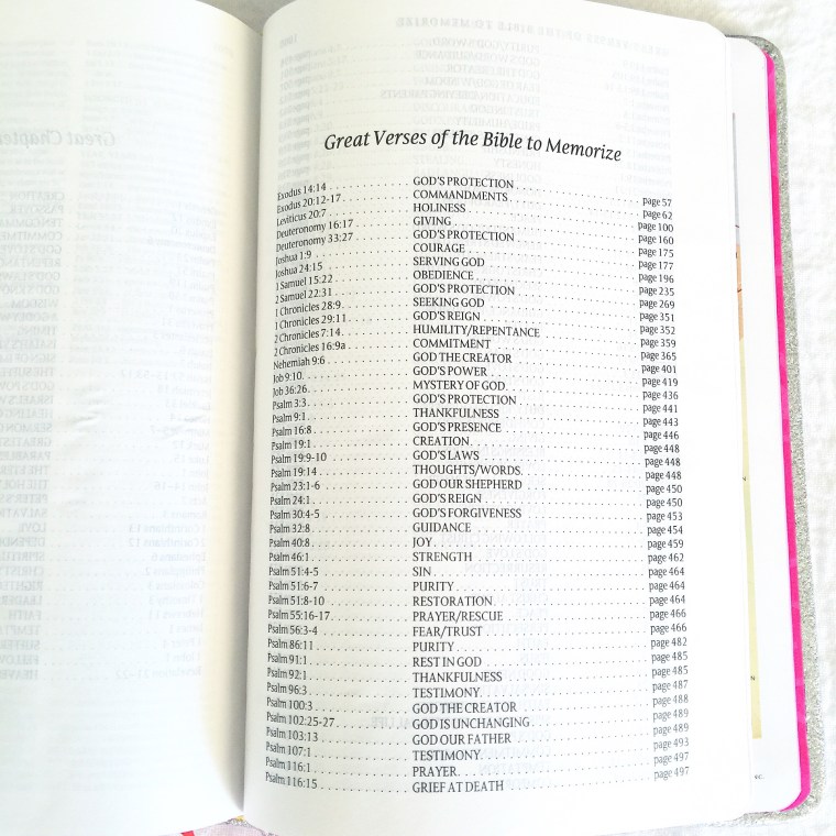 I really like the suggested chapters to read and verses to memorize, because it’s a great way for teens to navigate the Bible on their own. This section gives the reader the ability to look up helpful verses by topic to help see what God’s word says about what she is currently struggling with.
