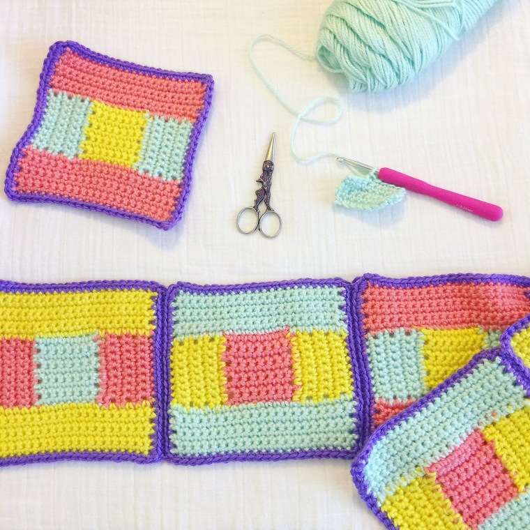 I am slowly making progress on crocheting one of my old patterns in order to update it. I’m loving these bright cheery squares! These colors together make me so happy.