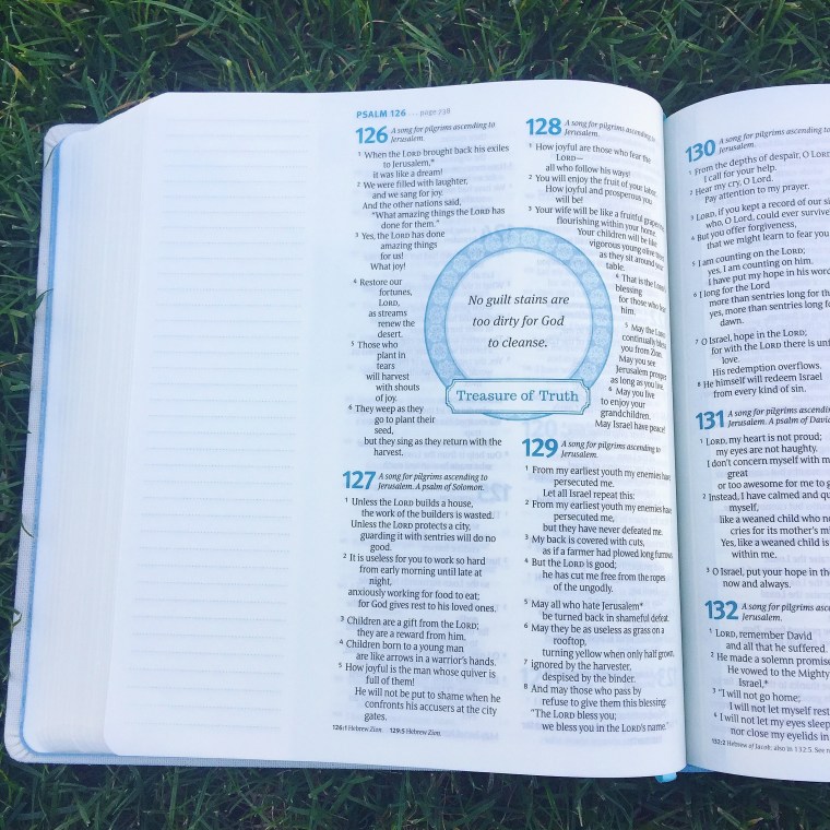 The New Living Translation is quickly becoming my favorite, and I like how geneologies are listed as a list for easier reading. The daily prayers, book introductions, “treasures of truth,” and character profiles help enhance the text while reading in between the devotionals. I especially like that the devotionals are numbered 1-365, rather than dated (Jan-Dec) so you can start and stop any time of year without feeling guilty to follow a specific date. Each devotional also gives the page number at the bottom for the next devotional, since the placement of the devotionals vary from book to book.
