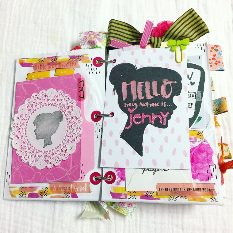 Not only will I be journaling in my Bible with all the cute pieces from this kit, but I decided to make a paper bag book for the devotional and journaling cards. You can see a tutorial and flip through video of my Word Nerd paper bag book here. It was so fun to grab a bunch of my favorite pieces from my scrapbooking days and add them to this book since I didn’t have to worry about the thickness. I used half the kit and each of the stamps at least once while making my book, and I still have pieces left over to use in my Bible. That just shows you how much is truly packed into these little kits.