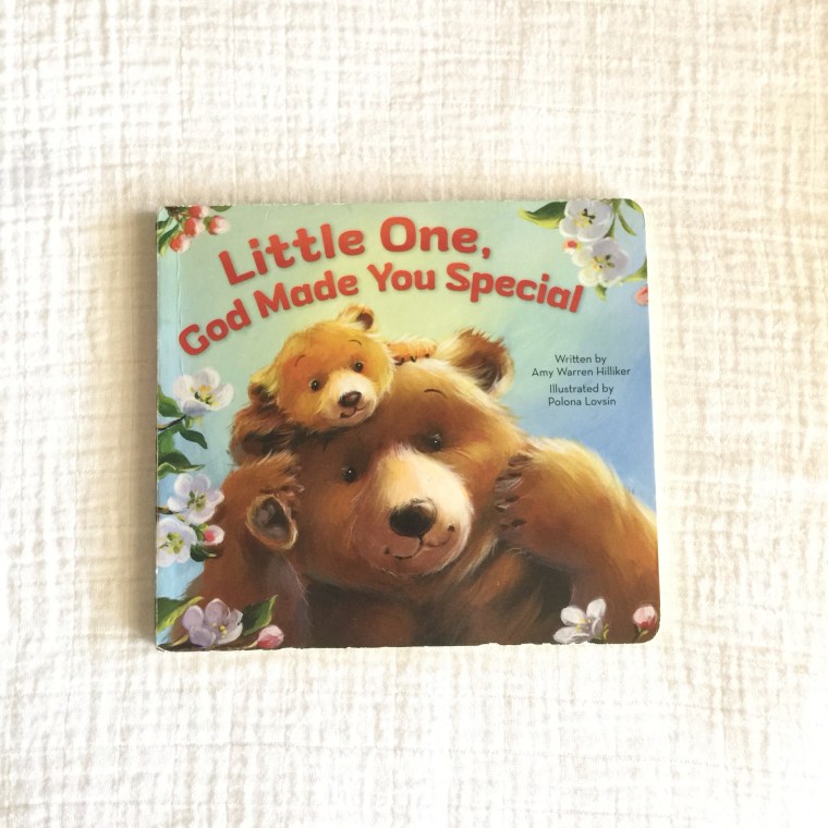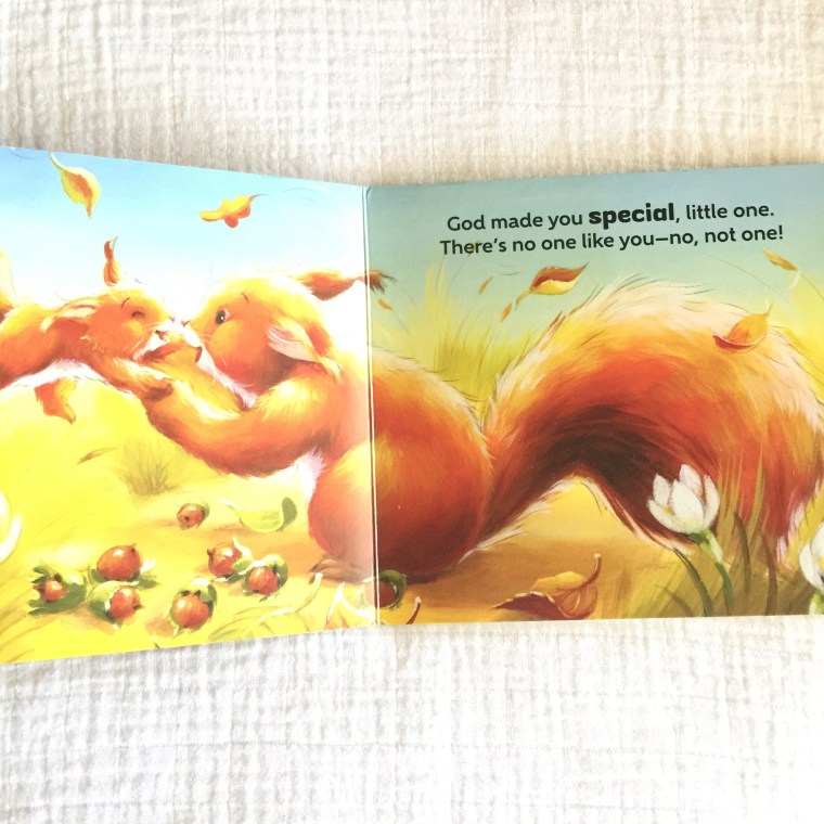 The second board book I want to share is called Little One, God Made You Special. I was drawn to the title of this book for my girls because my husband and I try to emphasize a lot how God made us special. We want our girls to grow up knowing that they are made in God’s image and that they are a precious gift. This book helps to reinforce those truths with soft illustrations of animals and a sweet rhyme that points out the different parts of us that are perfectly made by God. The book opens and closes with the message that “God made you special, little one. There’s no one like you–no, no not one!”