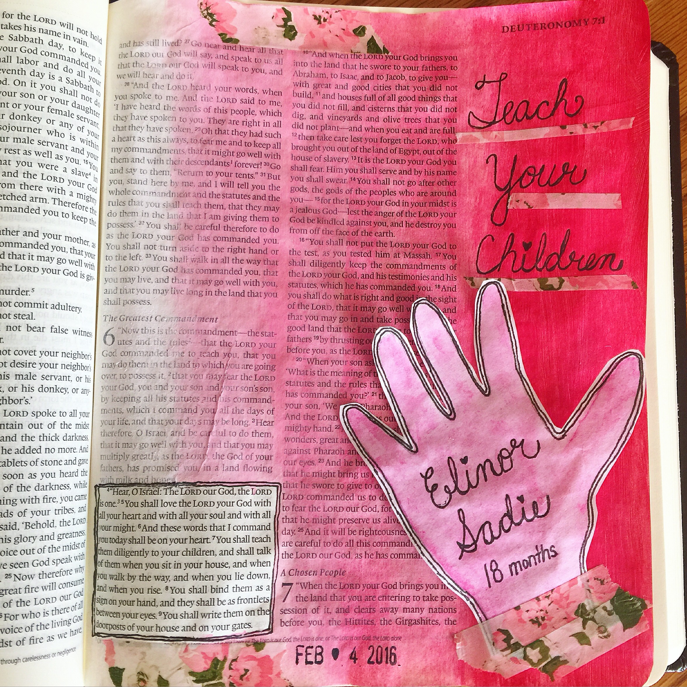 Deuteronomy: This page is really special because it contains my daughter’s tiny hand, and I will be able to flip back to this page as she grows and remember when she was this size. This passage in Deuteronomy talks about not forgetting what the Lord has taught you and passing it down to your children; my prayer is that my daughter will know and love Jesus one day, and I hope that as she sees me Bible journaling, she will be able to learn to love His word from me. For this page I used watered down pink and white acrylic paints to create an ombré effect. I traced and watercolored my daughter’s hand then added it in with washi tape so I would be able to lift it up and read the words underneath.