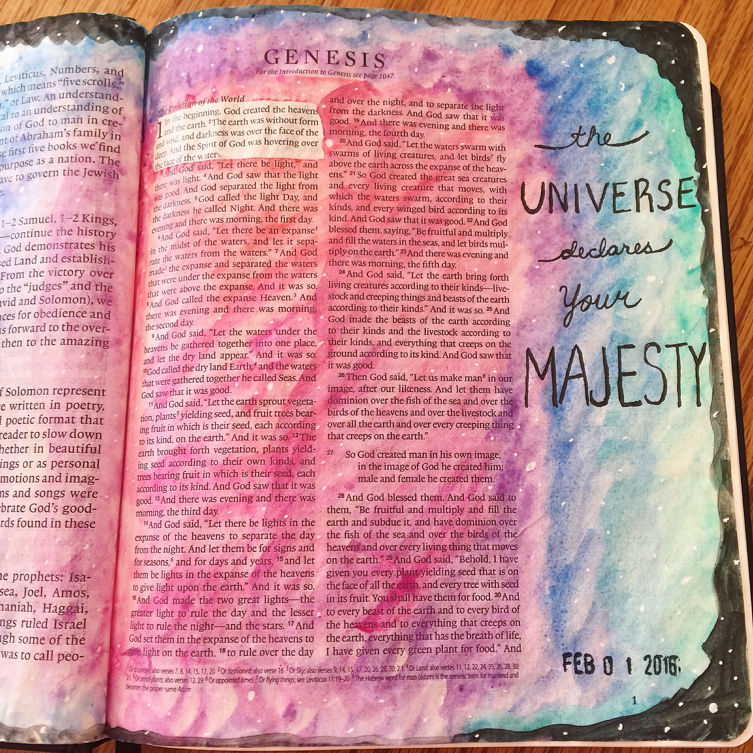 Genesis: I wanted to do a galaxy page in my new Bible for the beginning of Genesis. As I was using my new waterbrushes to add the color to the page, these song lyrics were going through my head: “God of wonders beyond our galaxy, You are holy, holy. The universe declares Your majesty, You are holy, holy. Lord of heaven and earth.” I decided to use some of these lyrics and write them on the page.