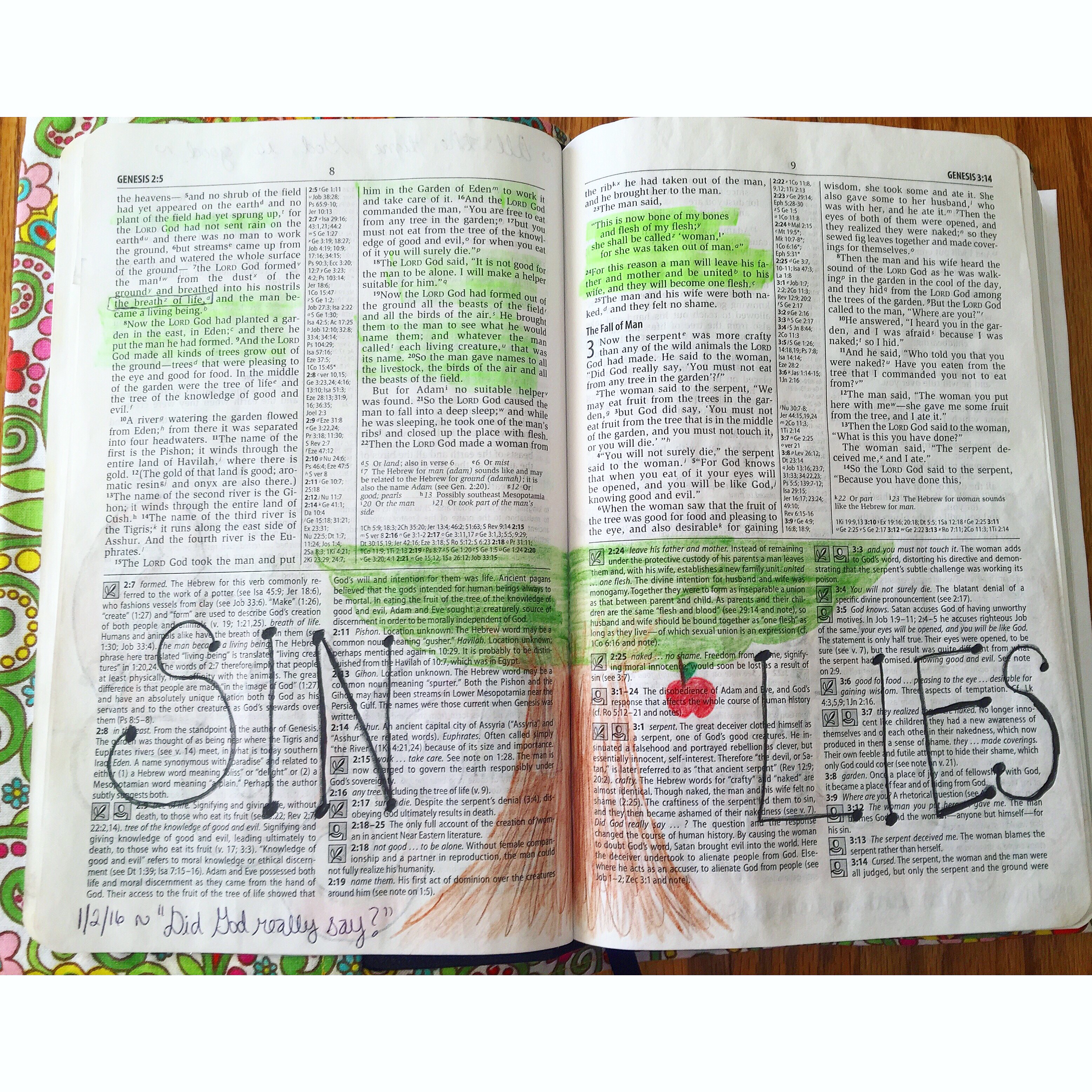 Since I’m a crafty person in general, I was surprised to find several supplies I already had to get started. I pulled out my NIV Study Bible that my parents gave me several Christmases ago, gathered up some colored pencils, and started to draw. I have had this Bible for awhile and it has sentimental value to me, so I was even more excited to make it very personal and expressive of myself. I started in Genesis and I was surprised at how easy it was to draw once I started. I decided to stick with colored pencils and mostly supplies that won’t completely obscure the writing. I mostly draw, color, and write in the study notes section and the margins.