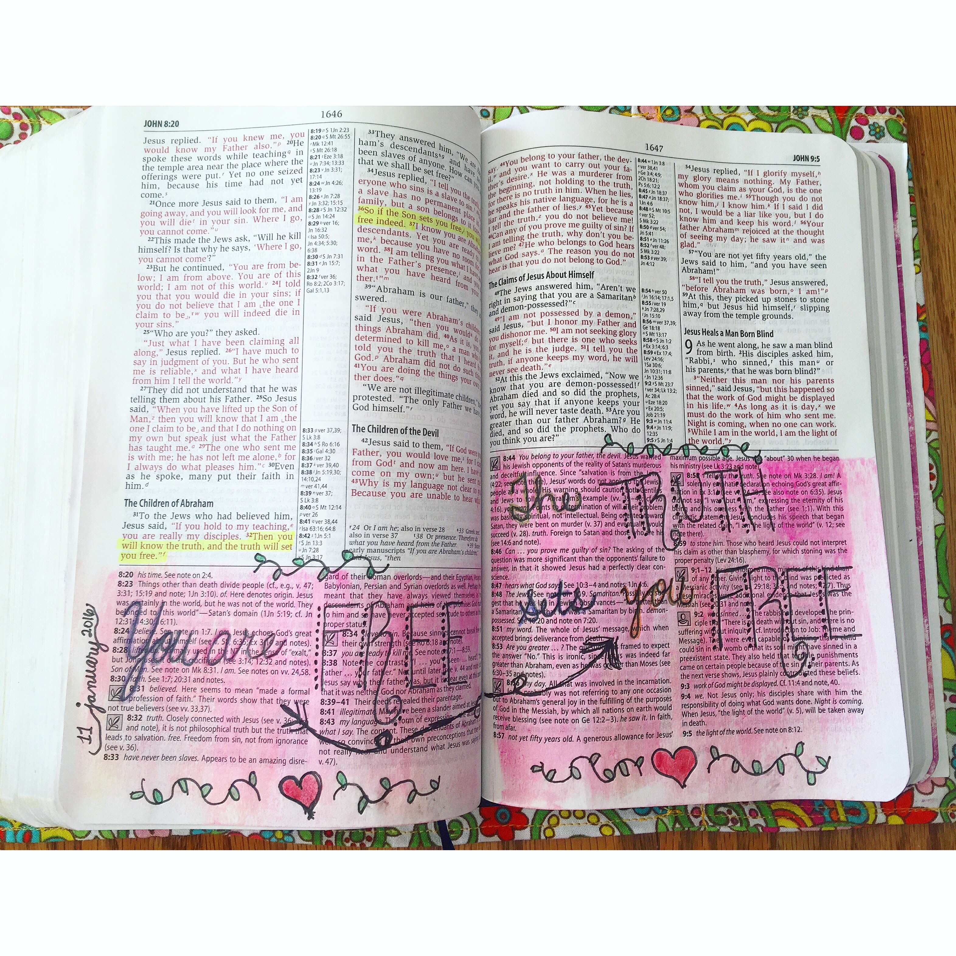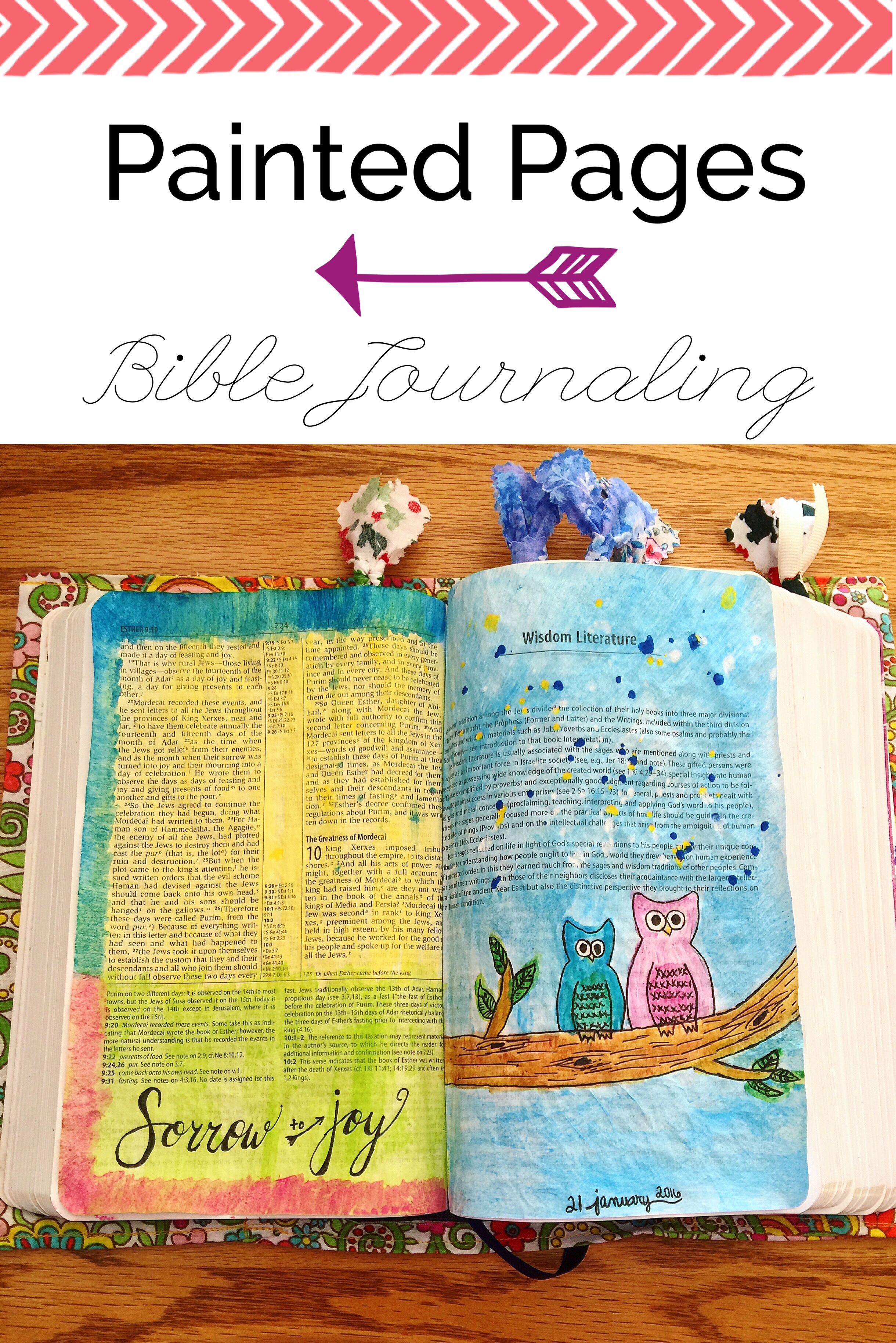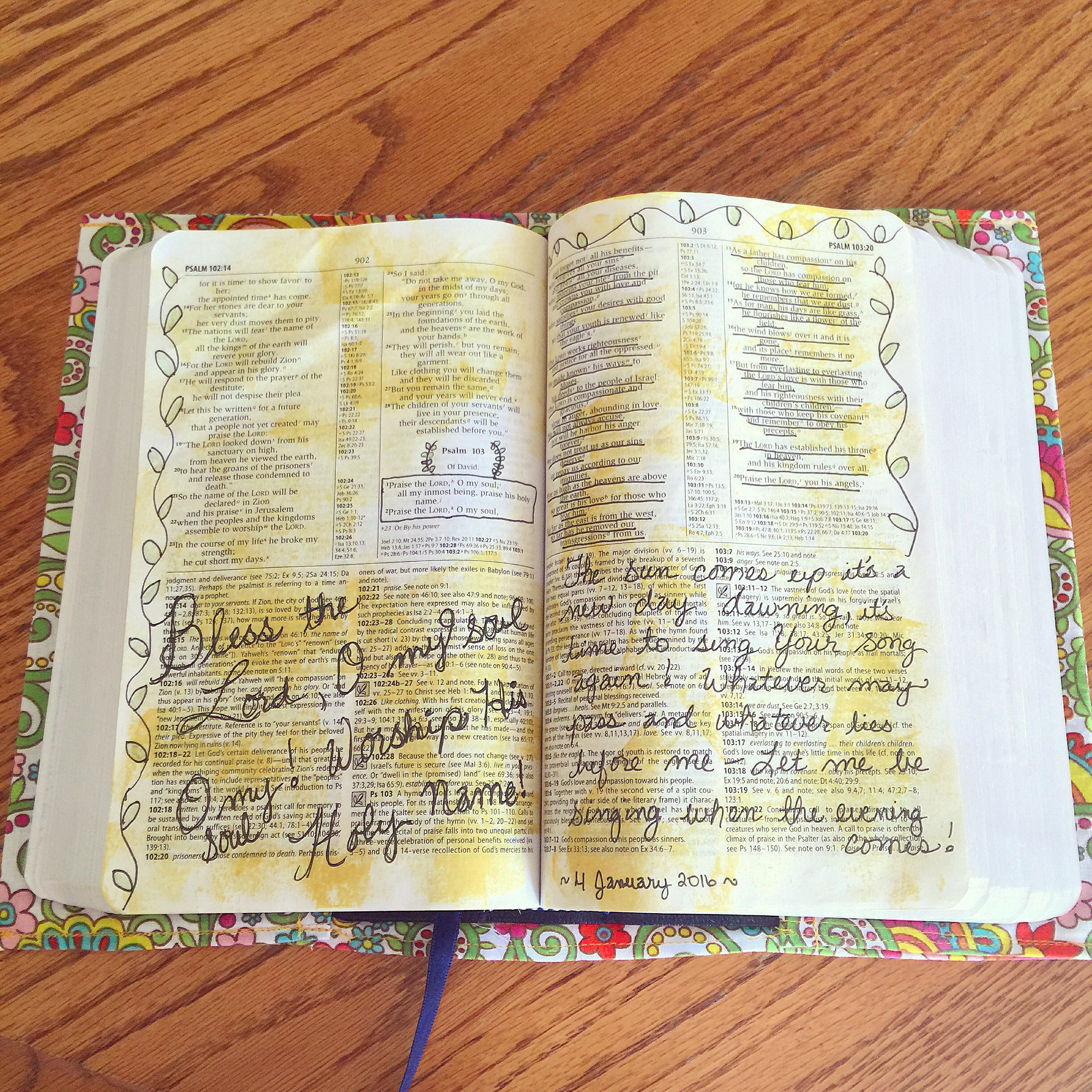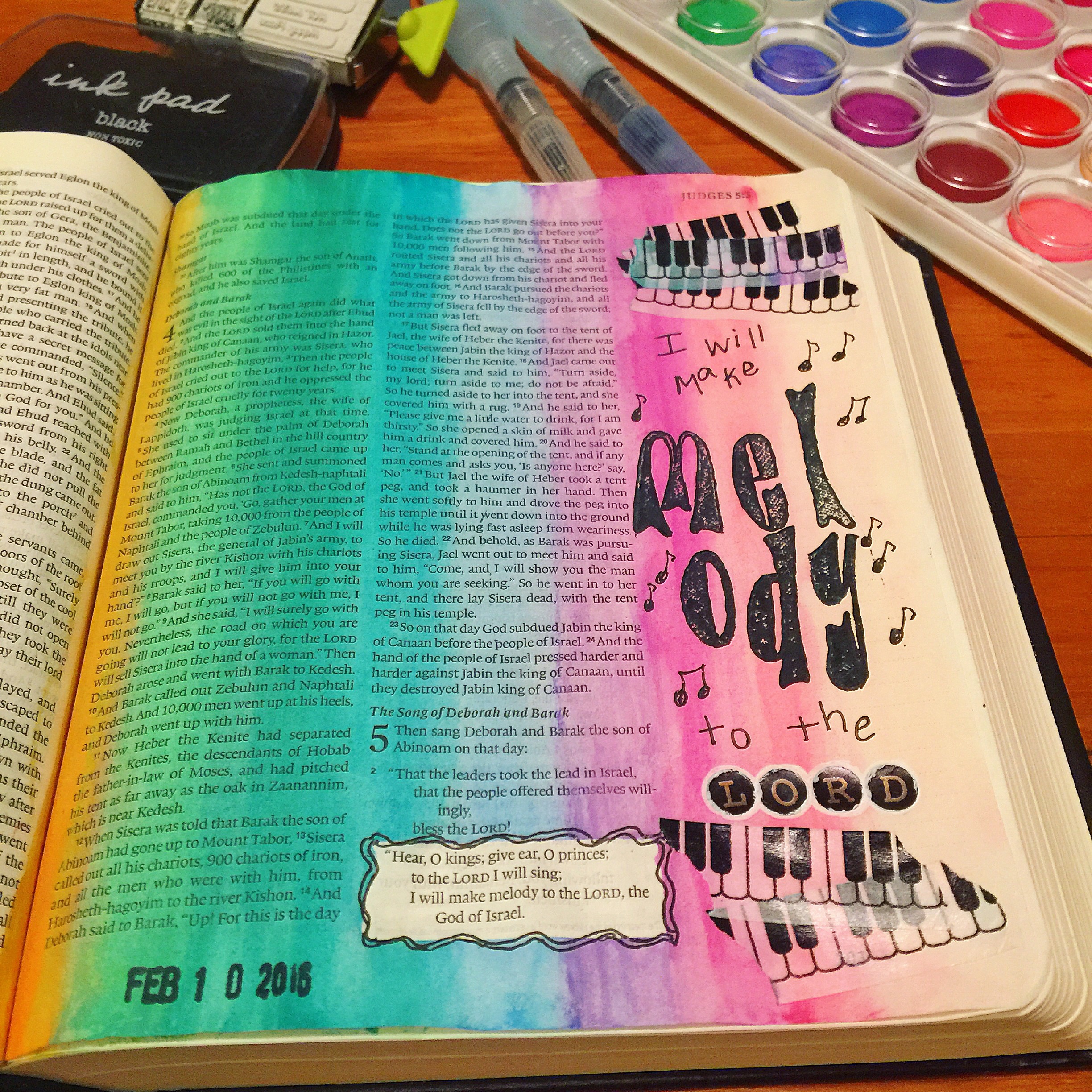 So far I haven’t had any issues of bleed through with either acrylic or watercolor paints, and I am using an NIV study Bible with traditionally thin Bible pages. Watercolor seems to be my favorite so far, which means I definitely see more watercolor pages in my future as I still discover my style. As my first month of Bible journaling almost comes to a close, I have found verses that I didn’t know were there, I’ve seen old favorites in a new light, and I have felt such freedom to express myself through this form of creative worship. I look forward to my Bible reading time, and I feel as though God is renewing me through this process, which has come at a time when I really needed it.
