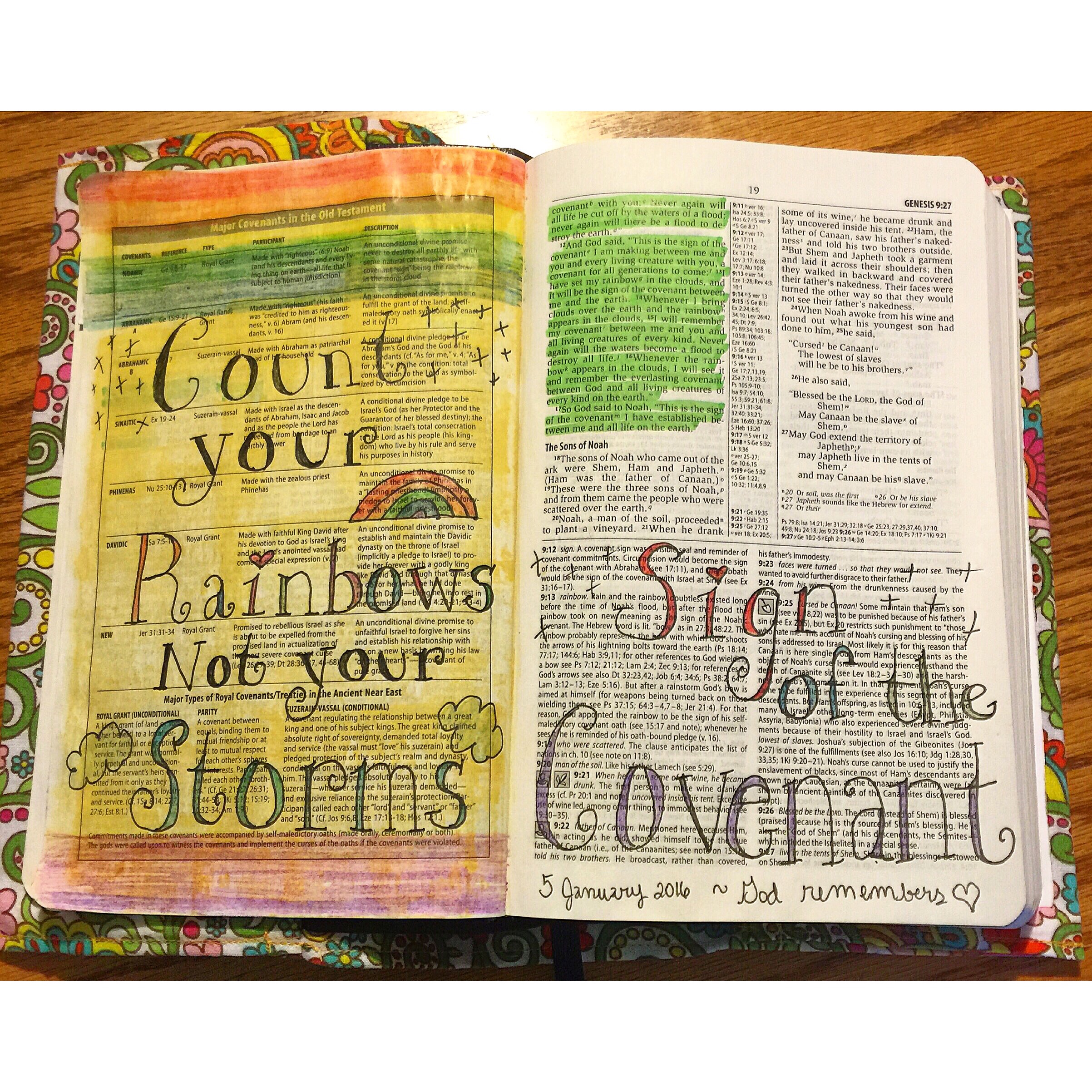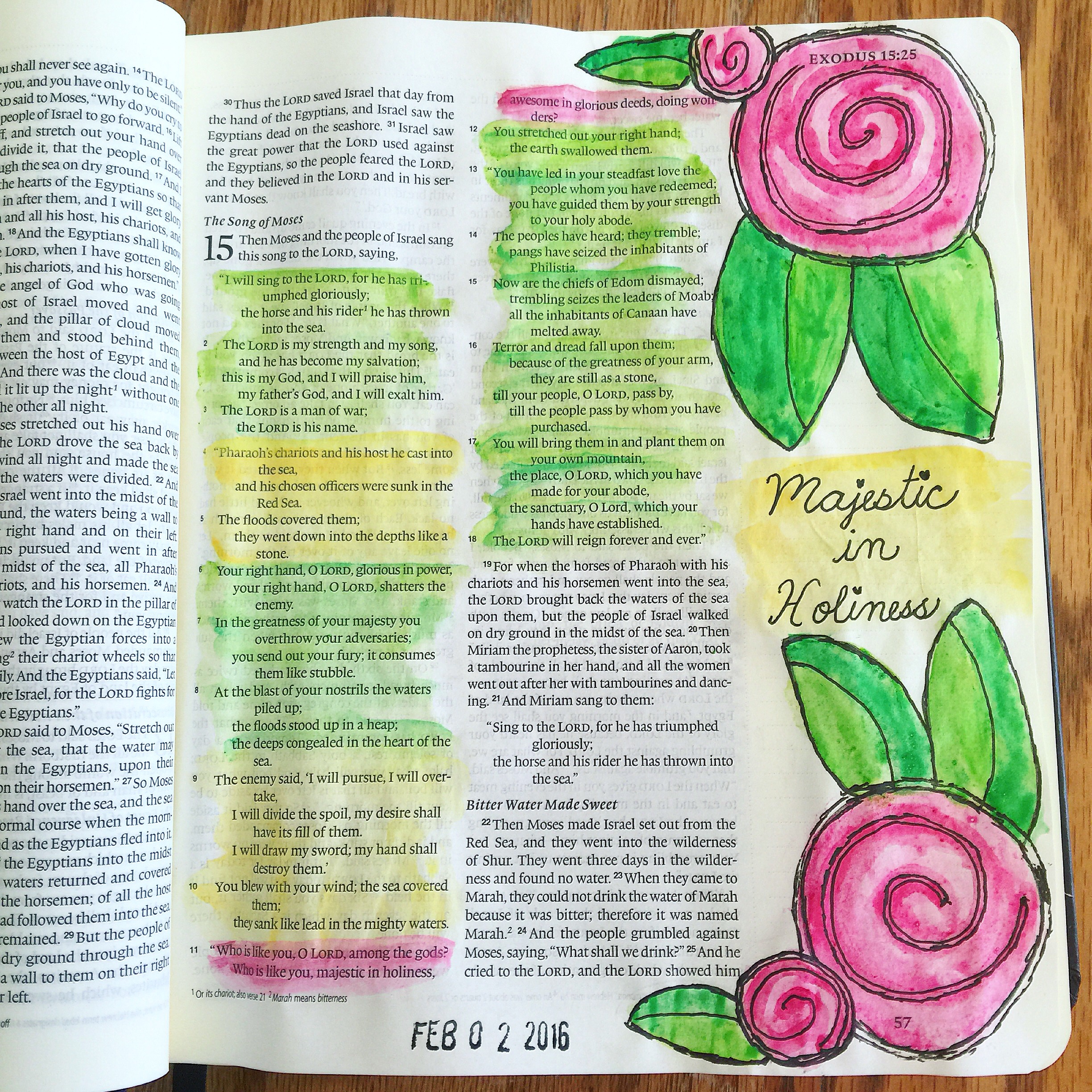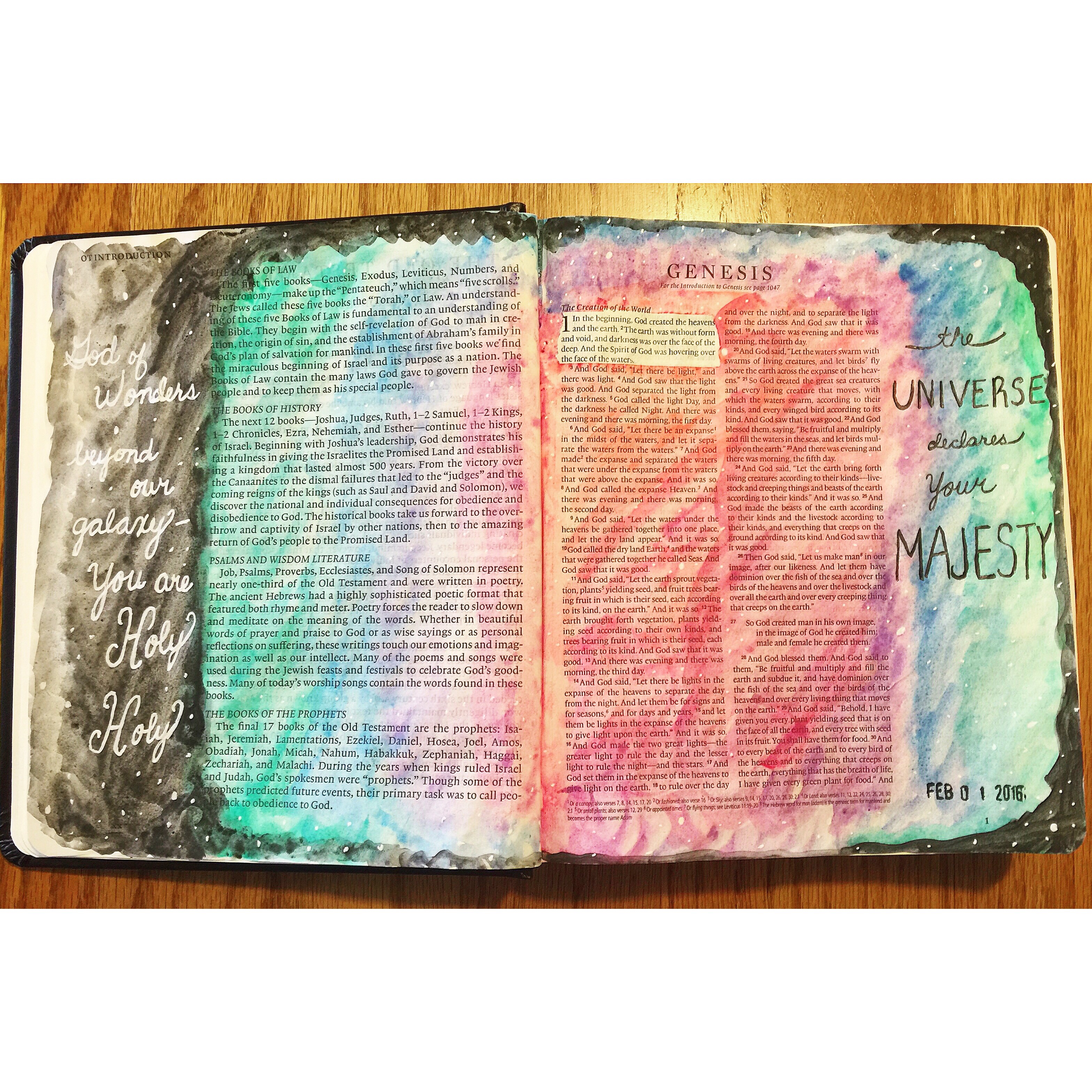 Genesis: I wanted to do a galaxy page in my new Bible for the beginning of Genesis. As I was using my new waterbrushes to add the color to the page, these song lyrics were going through my head: “God of wonders beyond our galaxy, You are holy, holy. The universe declares Your majesty, You are holy, holy. Lord of heaven and earth.” I decided to use some of these lyrics and write them on the page.