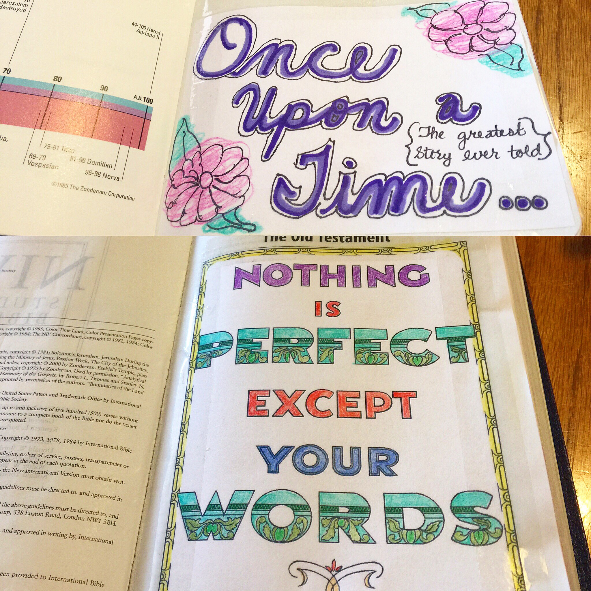 Another easy way that I found to add color and design to my Bible is to print out premade designs, color, then tape in (I didn’t have any glue, so tape for now). This allowed me to use some colored Sharpies too without having to worry about bleed through or ruining multiple pages.