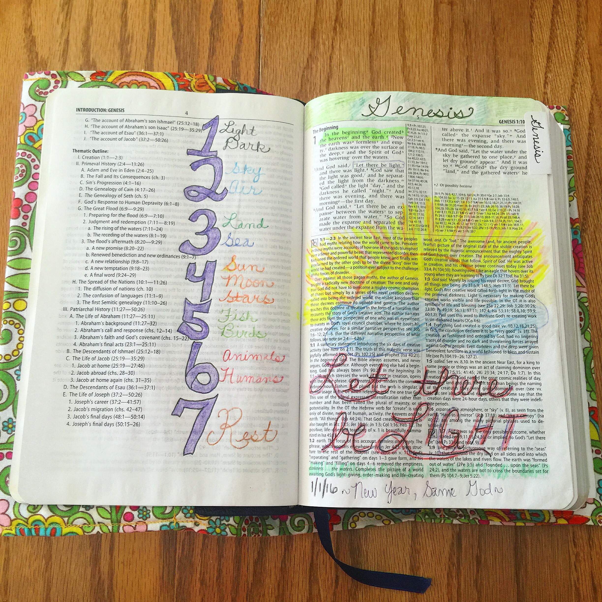 When I got my new Bible, I decided that I wanted to journal through it by doing one entry per book of the Bible each day. For Part 1, I will post my pages in Genesis through Ruth and briefly explain my process per page.