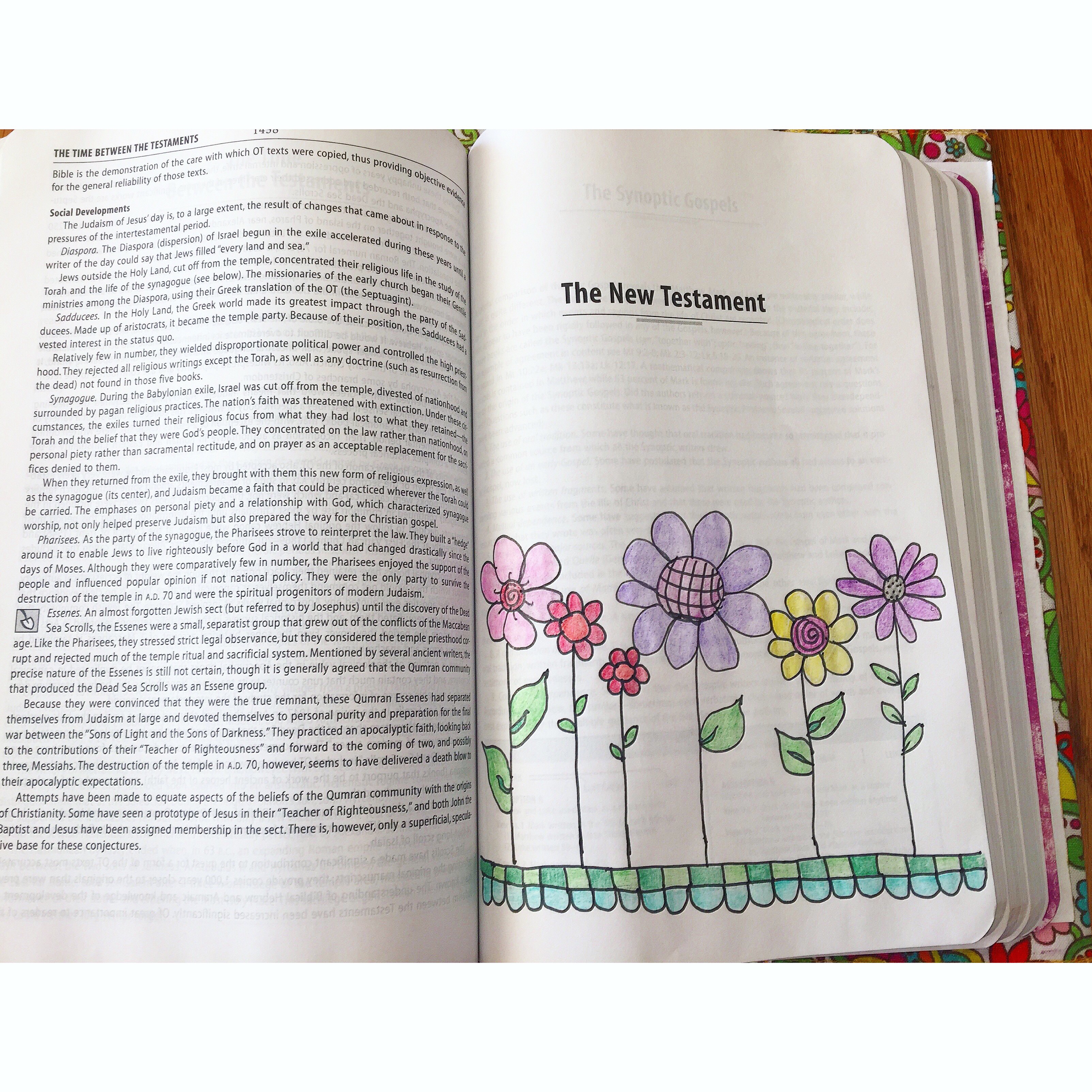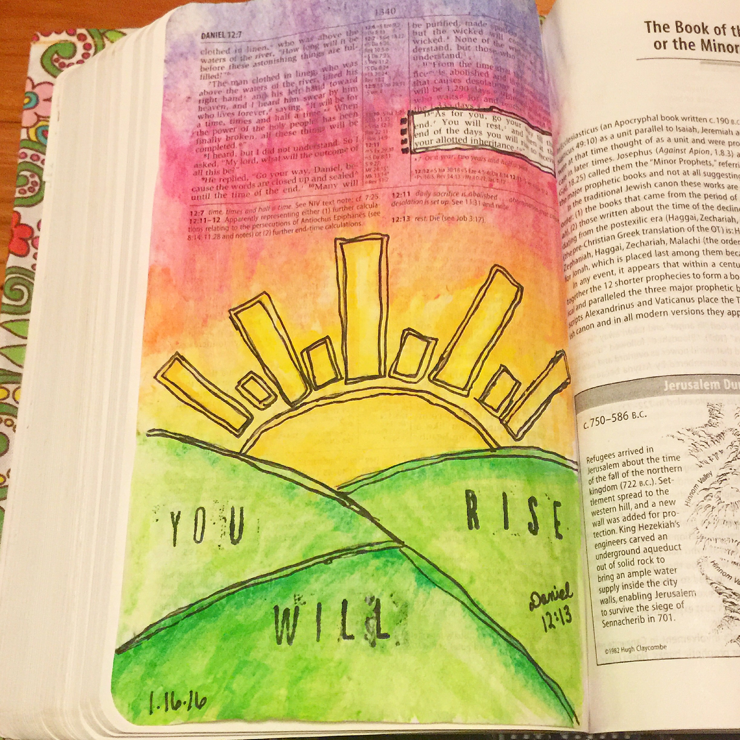 The first page I did with my new, $5 set of watercolors was paint this sunrise at the end of the book of Daniel. The last verse is a foreshadowing of how one day we will rise in Christ as believers, so painting a sunrise fit perfectly with this verse. I drew the image on first in pen, then did the watercolor. After it dried, I went back over the lines in pen then stamped the words “You will rise.” This is the first watercolor I have done in over 10 years at least, so watching a brief tutorial beforehand really helped.