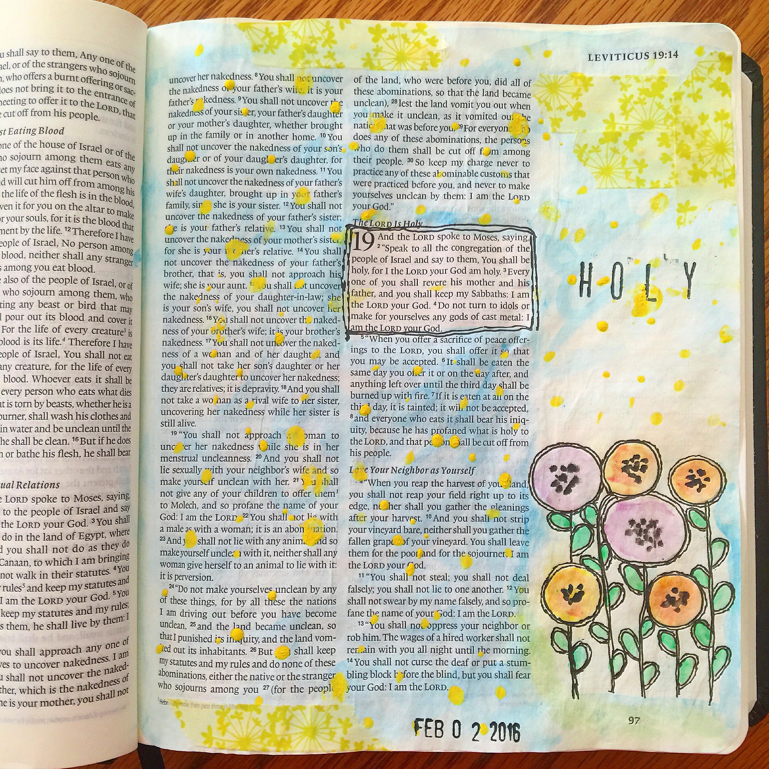 Leviticus: As I was doing the watercolor on this page, I really did not like how it was coming out. I thought that this might be a page I end up hiding because it doesn’t turn out. However, I just trusted the creative process and slowly waited for the paint to dry. I added the outlines, a simple stamping of the word “holy” and some washi tape. When it was finished, it turned out to be one of my favorite pages! Because I wasn’t quick to try and “fix” it by adding lots of extra things and just kept it simple, I feel that my patience salvaged the page.