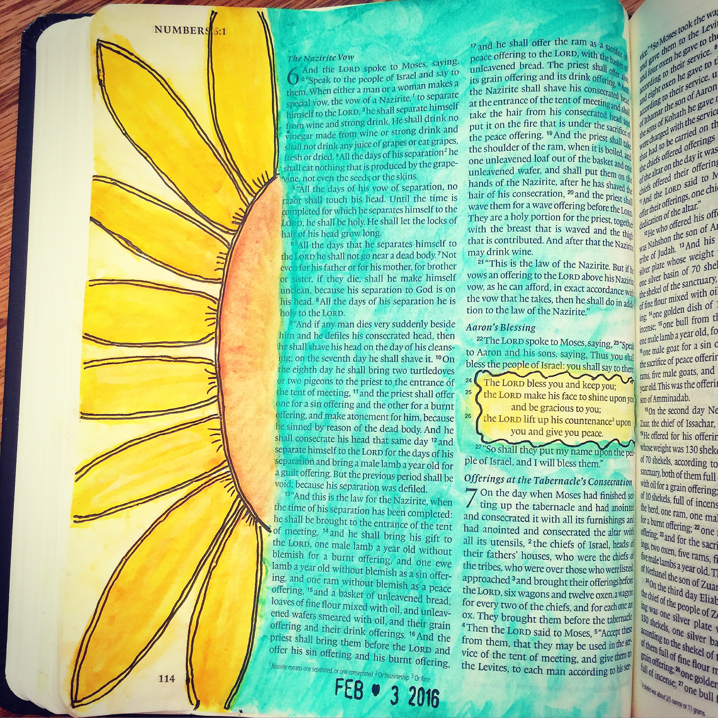 Numbers: When I realized that this popular blessing was in the book of Numbers, I knew I had to do a sunflower page; “The Lord bless you and keep you. The Lord make His face to shine upon you and be gracious to you. The Lord lift up His countenance upon you and give you peace.” I wanted to rewrite part of the verse into the margin, but I loved the simplicity of the sunflower so much that I decided to leave it alone. Again, keep it simple. I later wrote out the verse in my prayer journal.