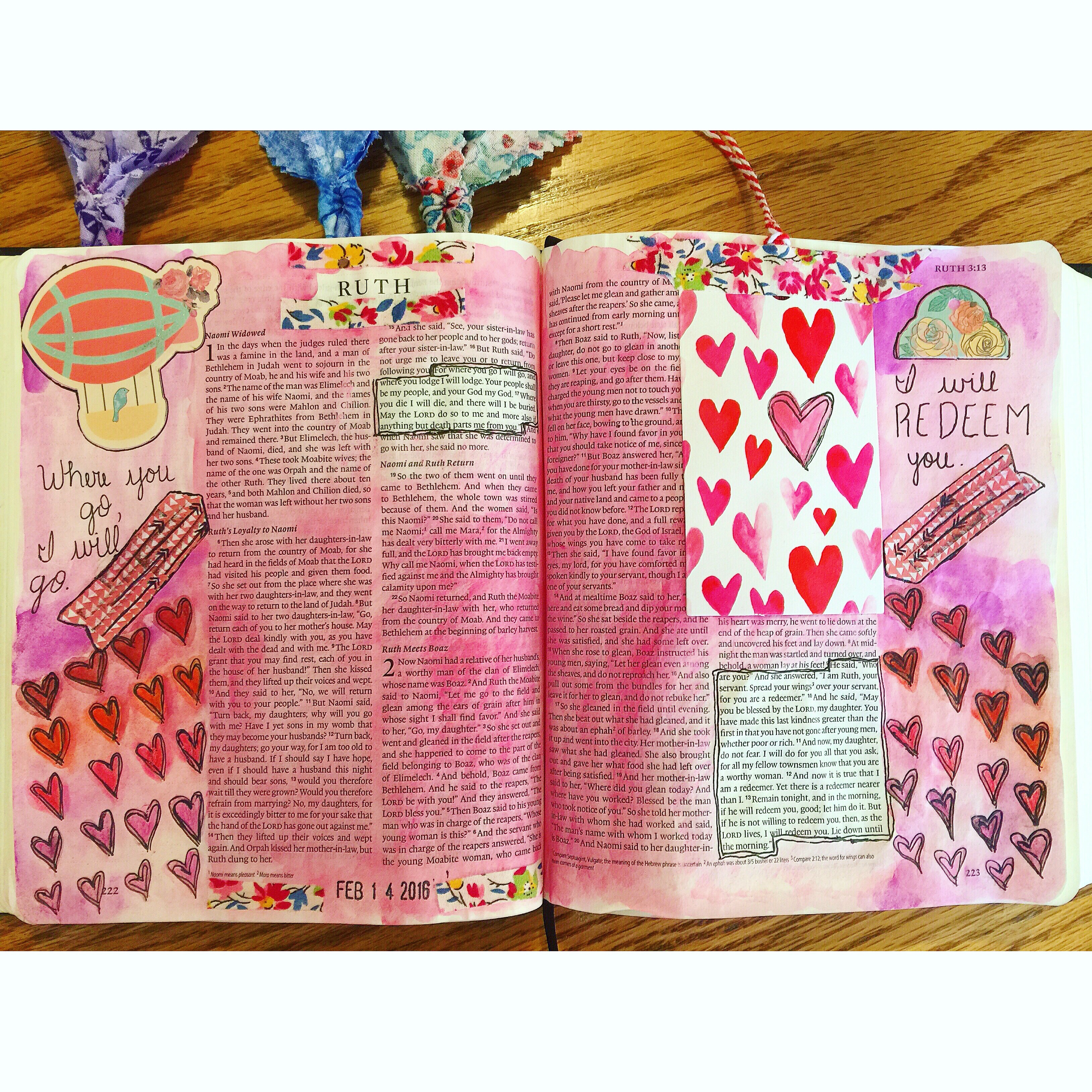 Ruth: When it came time to do my journaling for Valentine’s Day, I happened to be at the book of Ruth for my next page to illustrate. This was an appropriate passage to do for Valentine’s Day, since three and a half years ago I “pulled a Ruth” by sending a Facebook message to a “friend” after feeling prompted by God, which led to my happily ever after with my best friend and now husband! When I was single, I studied this passage a lot, as it tends to be the thing to do, but the main thing I learned from my various studies is that the point of this story is not about a woman finding a husband under what seems to be impossible circumstances; it’s about our Great Redeemer saving us in an impossible way so that we can be joined to Him forever! What better way to celebrate a day about love than to reflect on the great love that God lavishes on us by redeeming us in our sin and saving us for a life of purpose for Him.