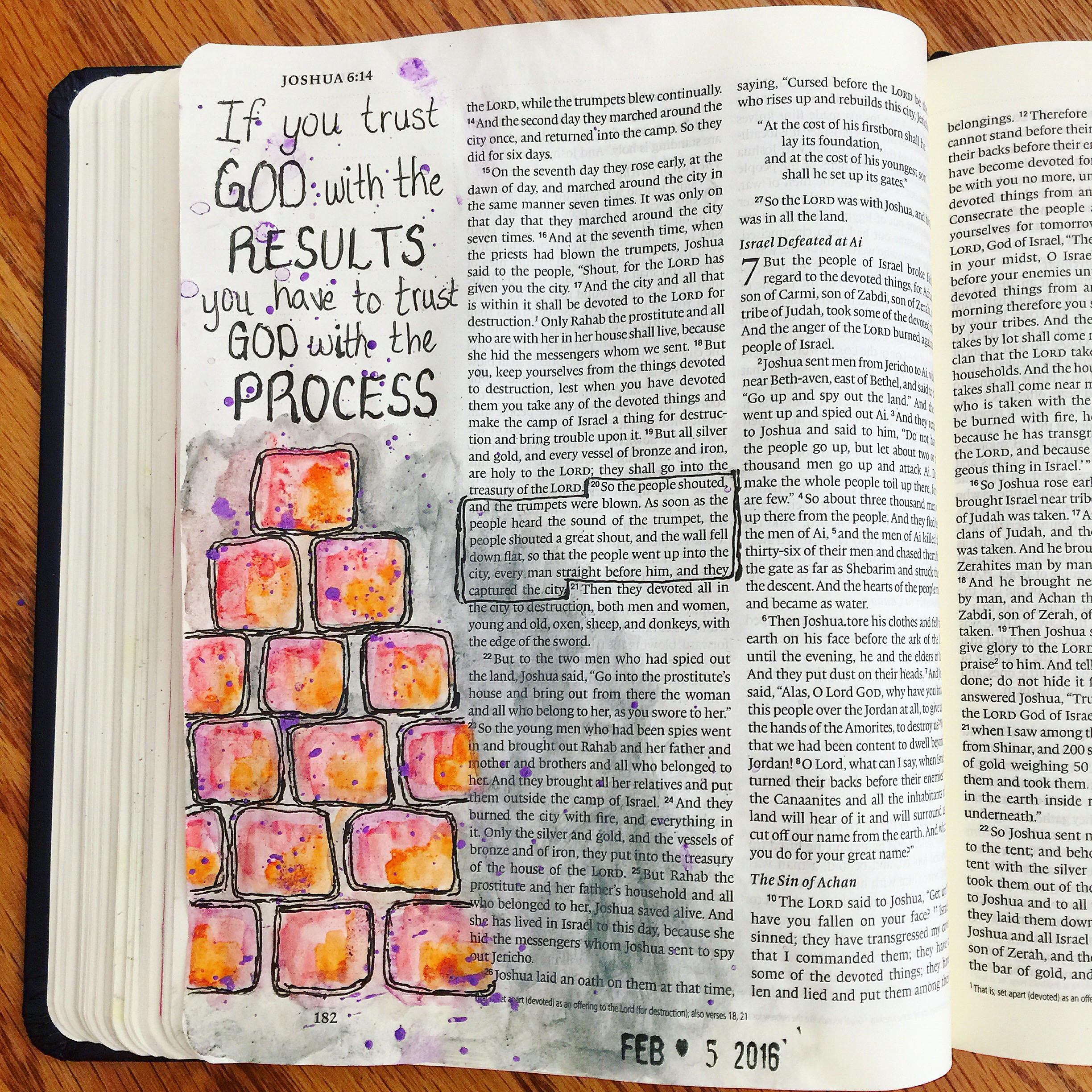 Joshua: This page and saying was inspired by several other Bible journalers. “If you trust God with the results, you have to trust God with the process.” The fall of Jericho seems “normal” to anyone who has grown up listening to the story, but if you stop to think about the process God used to help the Israelites defeat Jericho, it’s really quite strange. Sometimes God works in ways we don’t understand, and in the midst of the process, I often feel like God doesn’t know what He is doing. But God does know, and I have to trust Him in the process just as much as when I see the end result.