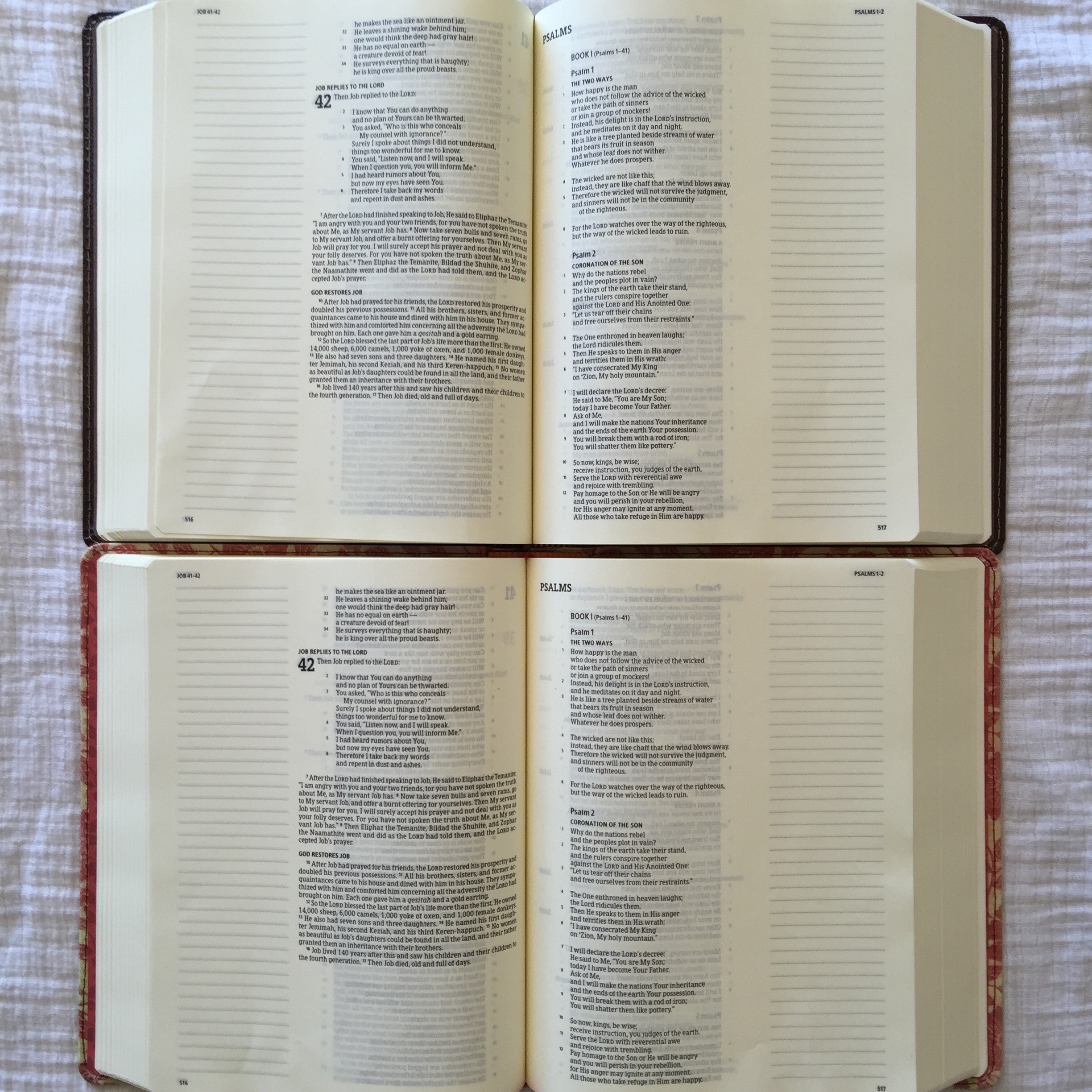 I especially like that these Bibles are single column, which makes it easier to take notes right next to the verse you are studying. As far as size comparison, this Bible is bigger than my ESV double column, but smaller and lighter than my Inspire Bible. As with all journaling Bible, the pages are fairly thin and would require pens and highlighters that won’t bleed through. My favorite pens to use are Micron pens and gel highlighters, which neither of these will bleed through the page.