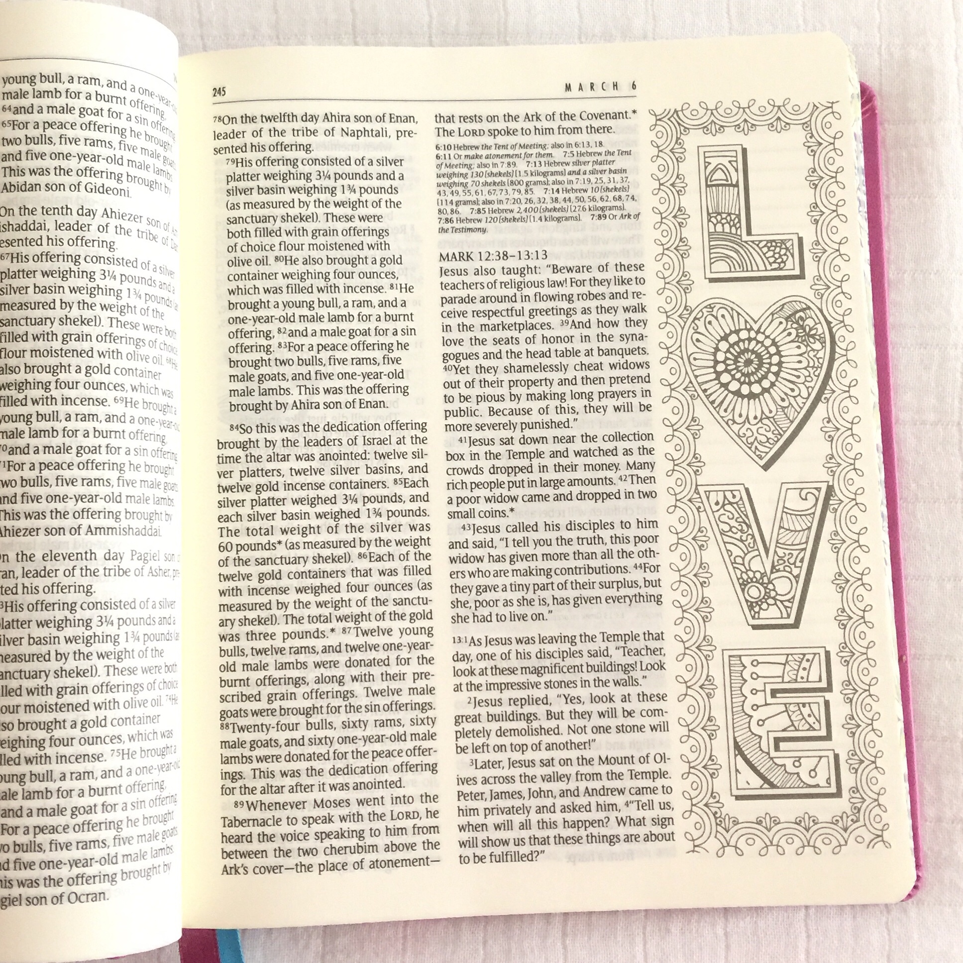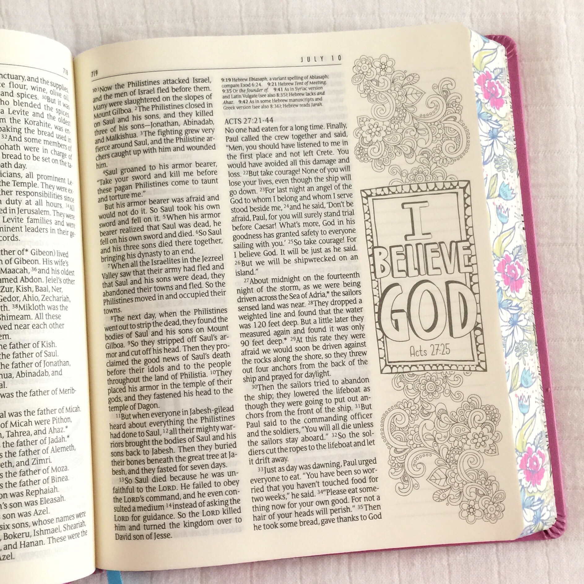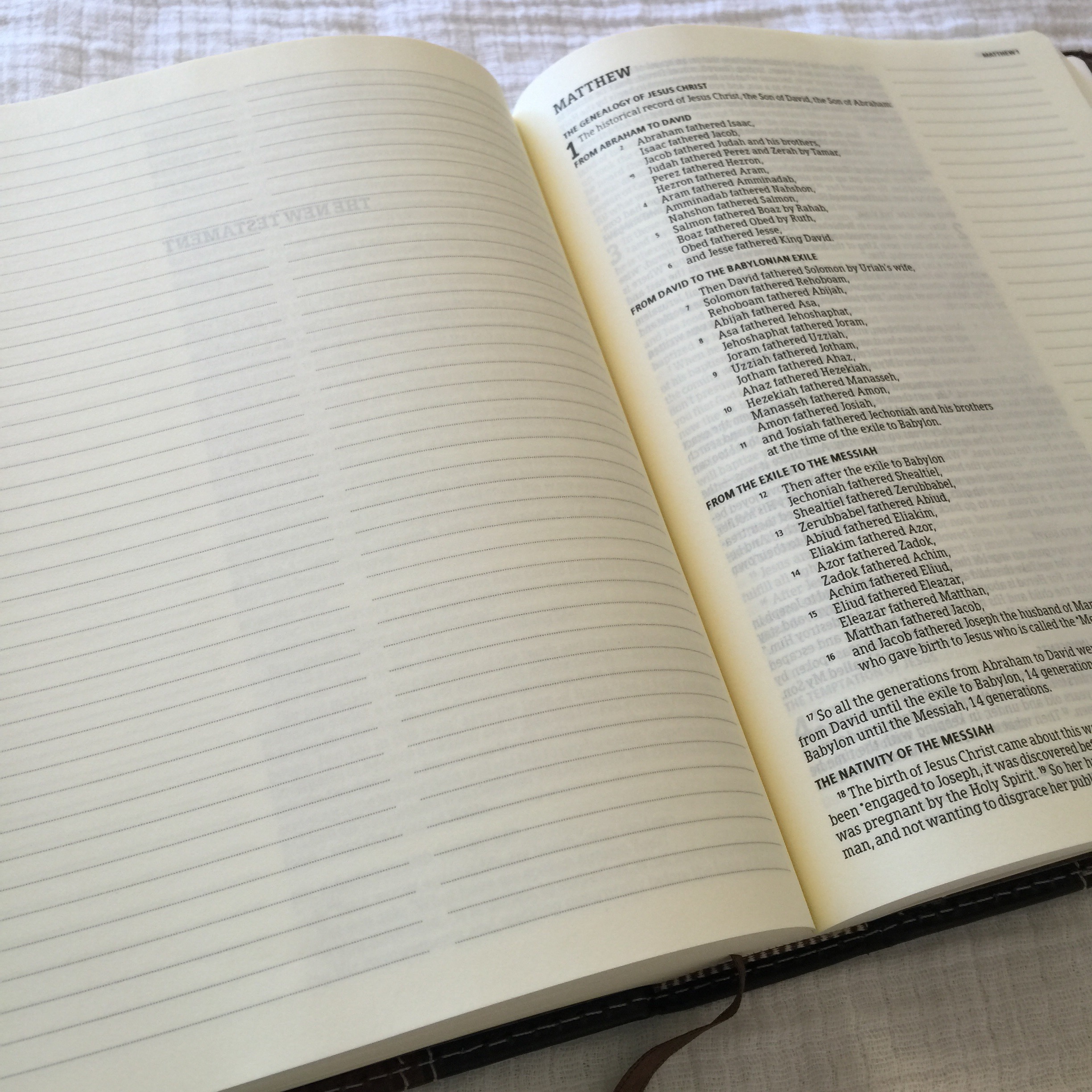 Overall, I highly recommend this Bible for women looking to Journal their way through a yearlong journey of Bible reading and devotions directed towards the thriving heart of a woman. I can’t wait to use this Bible and add my writing and art, as well as my heart, to the margins.