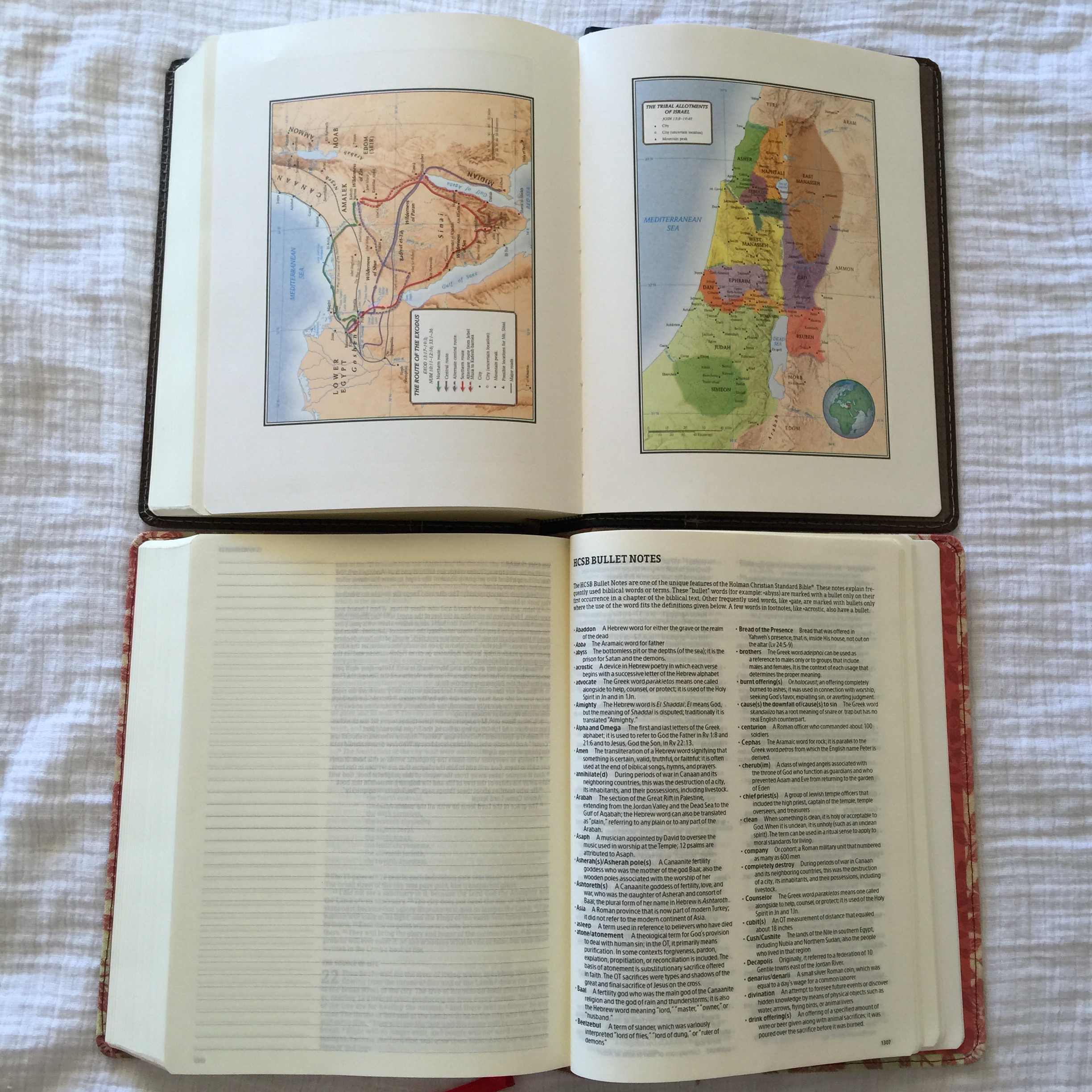These Bibles are beautiful and well made. Each margin is lightly lined to help guide notetaking, and even some of the blank pages are fully lined to offer more space for writing. The Bibles include the HCSB notes in the back, a concordance, and full-color maps. Each Bible lays flat when open to make it easier to study and write on a flat surface.