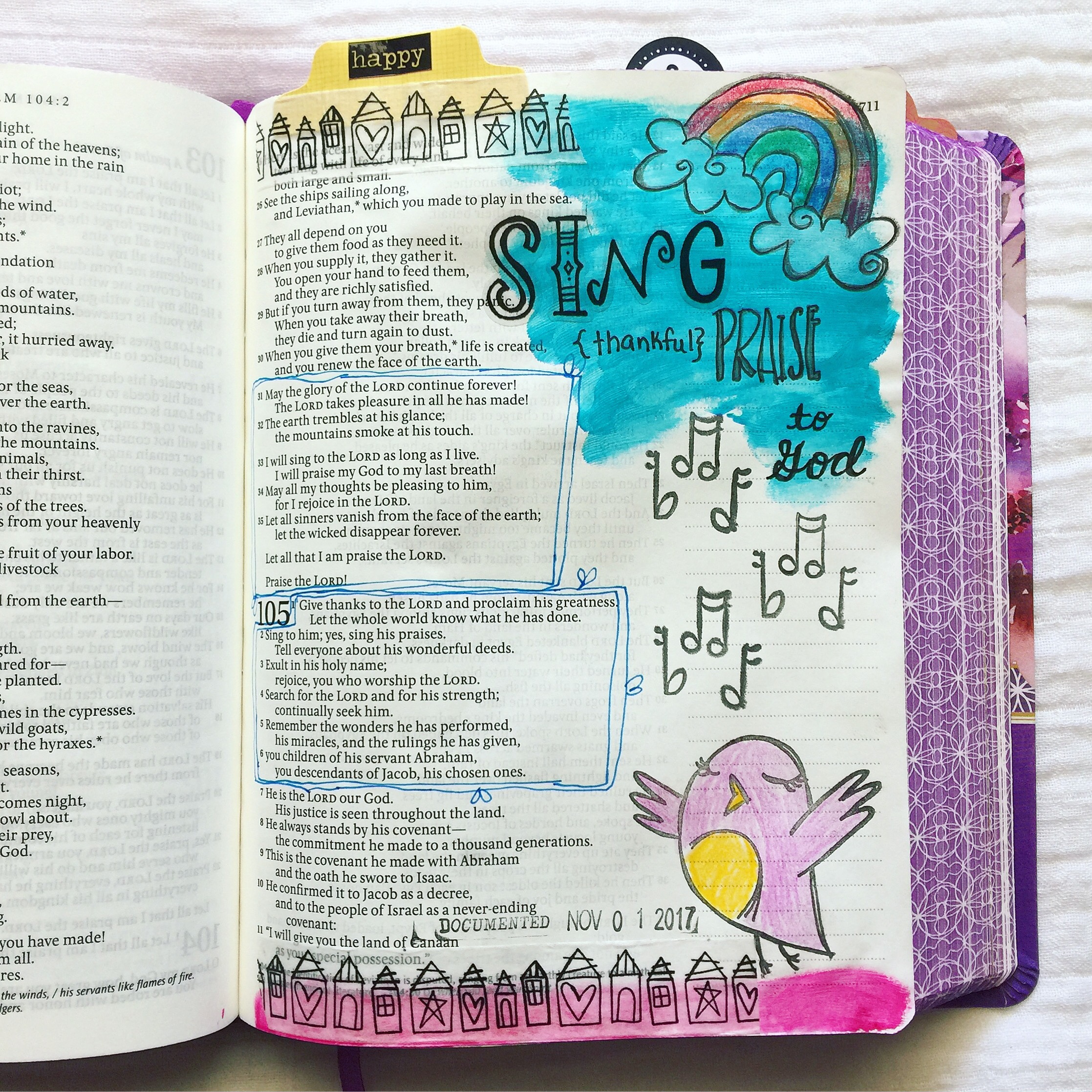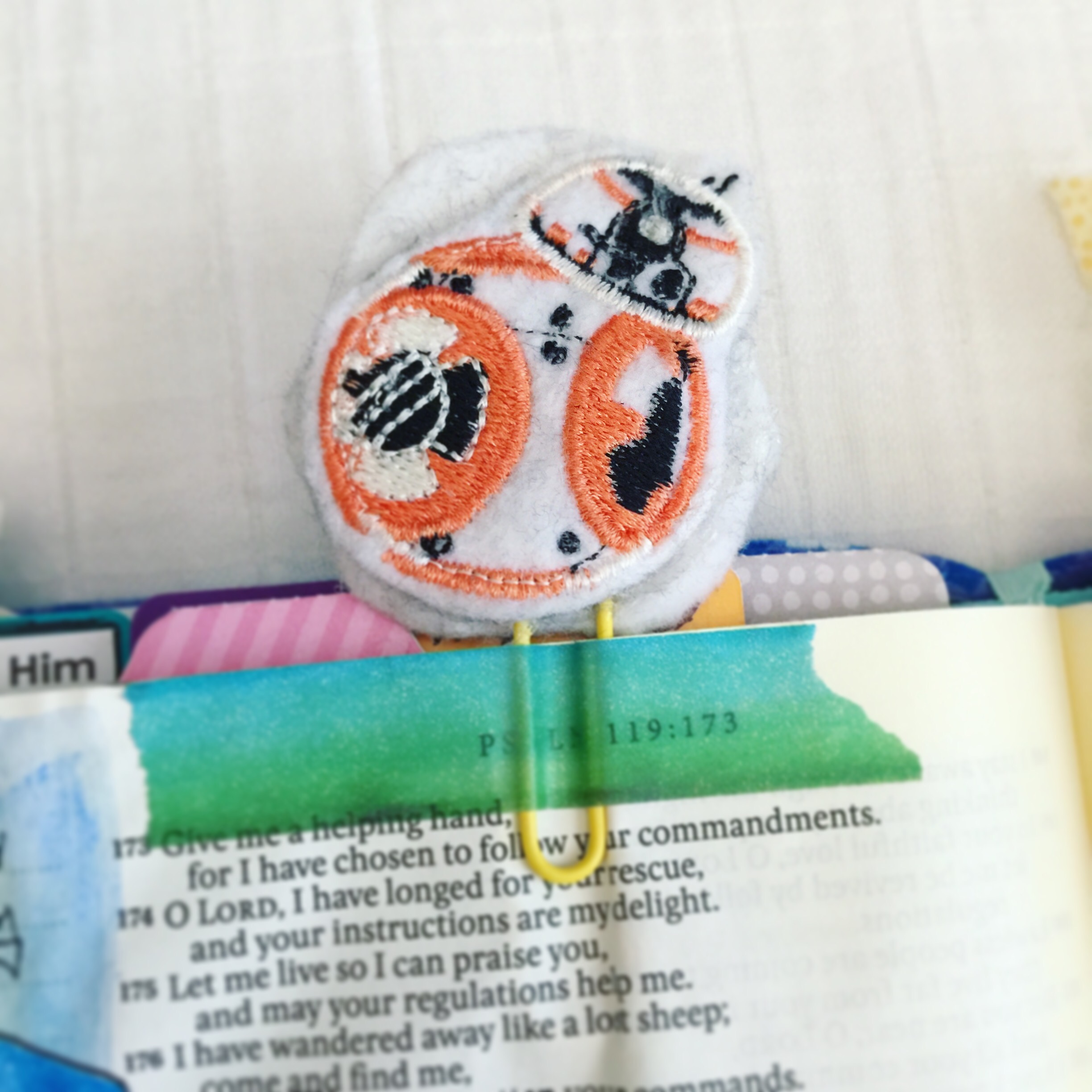I did a quick watercolor background in the margin with my Neocolor II and a waterbrush. I glued down the printable pieces and then added some Alpha stickers. The BB8 and Storm Trooper patches were leftover from an embroidery project I did last year and made the perfect page marker. I may do another Star Wars themed page on the other side to go with the Storm Trooper. That tiny light saber just makes me ridiculously happy. I don’t think I will forget this Psalm anytime soon.