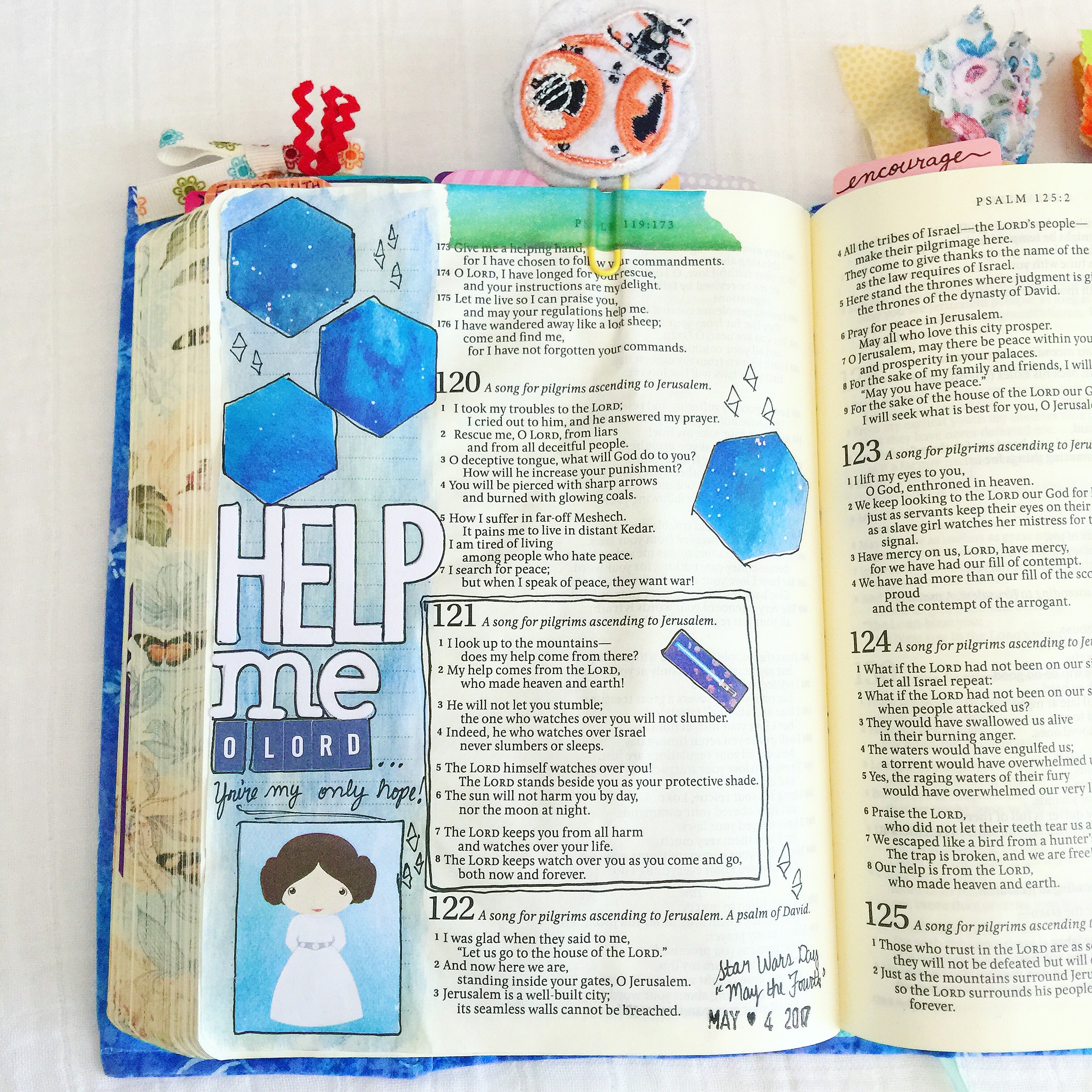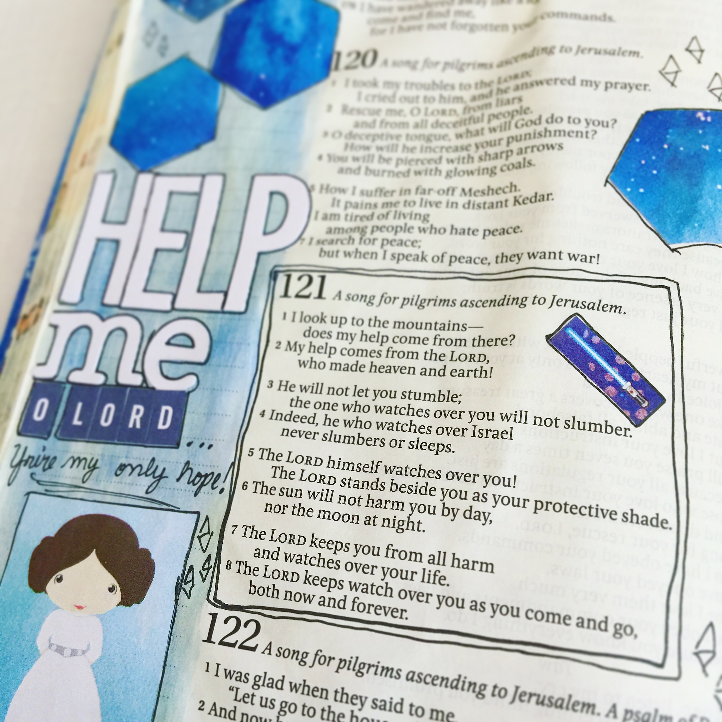 “May the Fourth be with you.” Yes it may be silly, but it’s fun! I decided to do a Star Wars page in my Inspire Bible. Yes that’s right. The iconic line from “A New Hope” when Princess Leia is asking for help stuck out to me and reminded me of Psalm 121:1-2 “I look to the mountains–does my help come from there? My help comes from the Lord who made heaven and earth.”