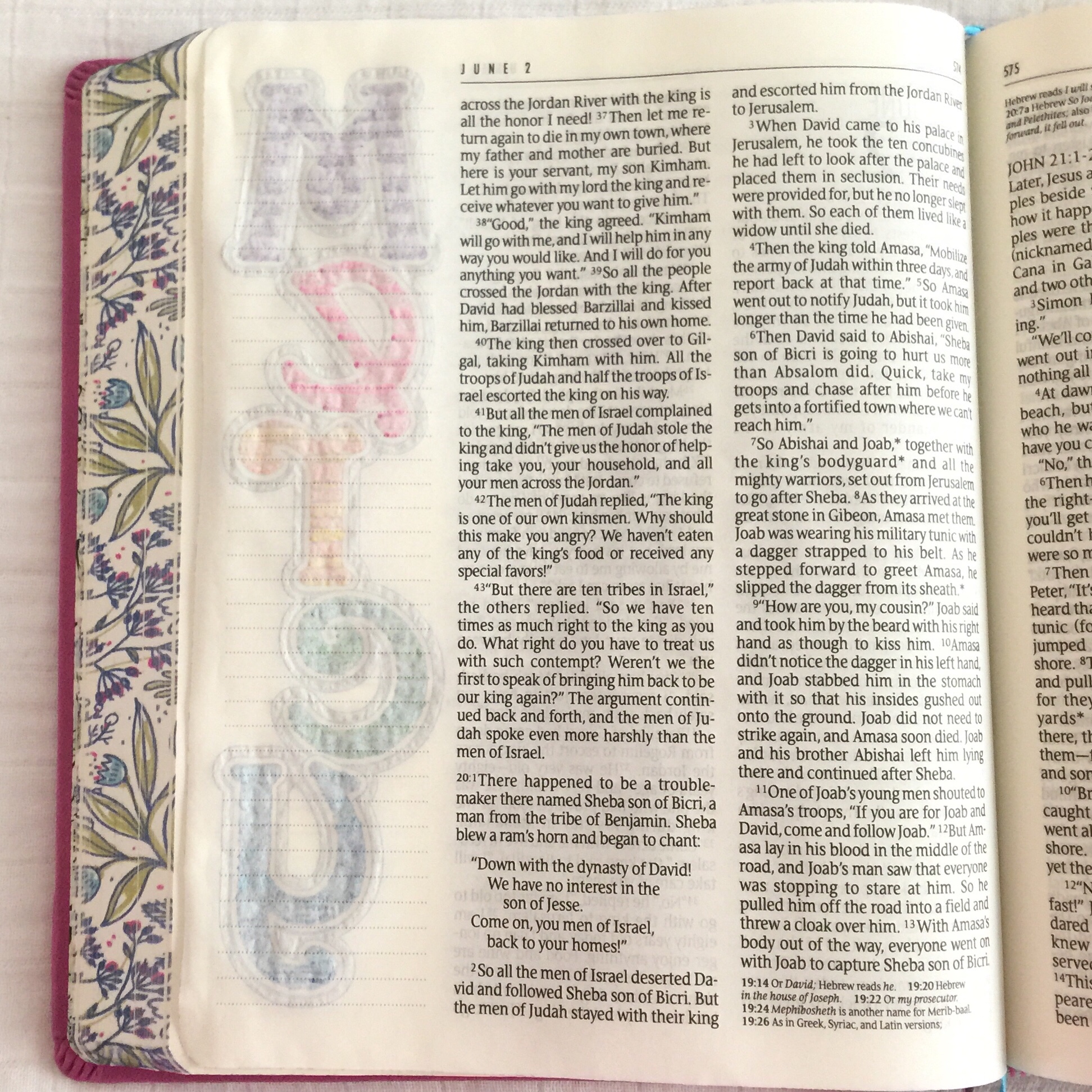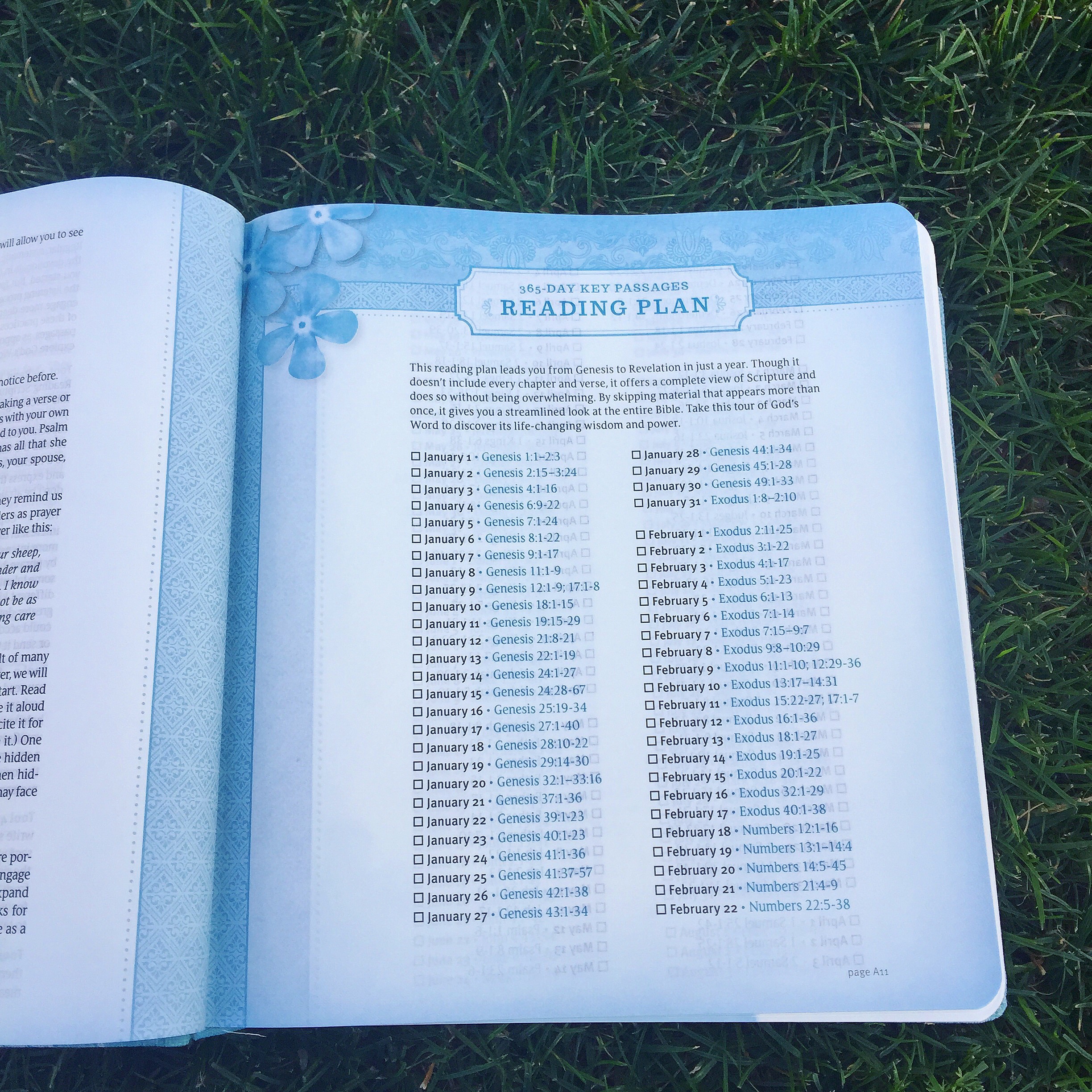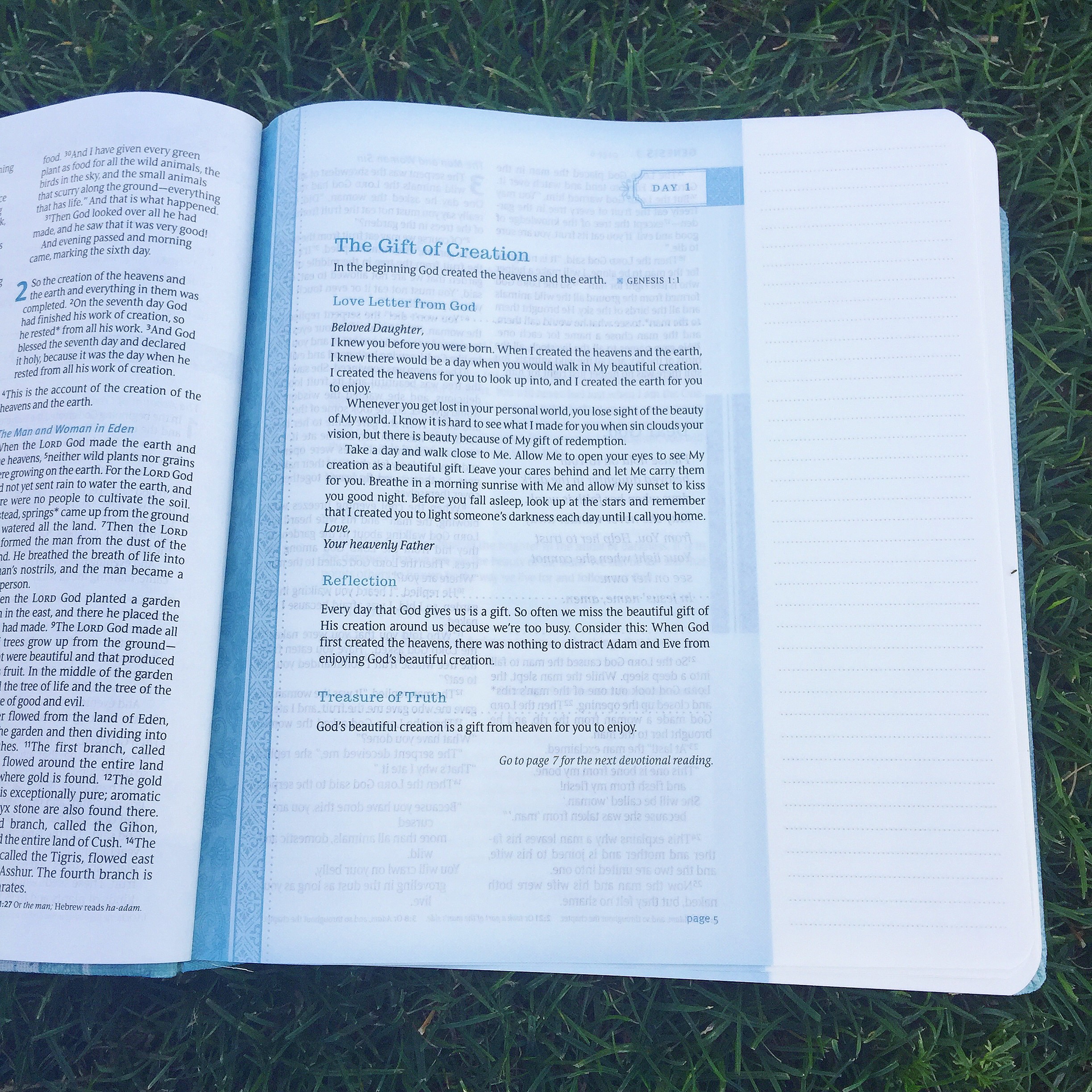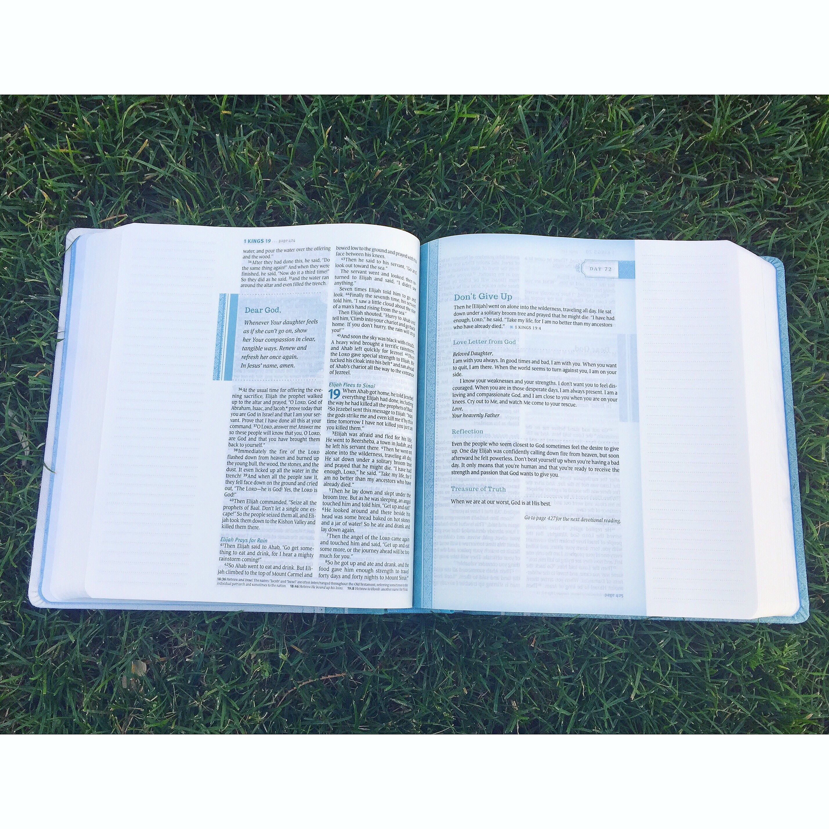 The New Living Translation is quickly becoming my favorite, and I like how geneologies are listed as a list for easier reading. The daily prayers, book introductions, “treasures of truth,” and character profiles help enhance the text while reading in between the devotionals. I especially like that the devotionals are numbered 1-365, rather than dated (Jan-Dec) so you can start and stop any time of year without feeling guilty to follow a specific date. Each devotional also gives the page number at the bottom for the next devotional, since the placement of the devotionals vary from book to book.