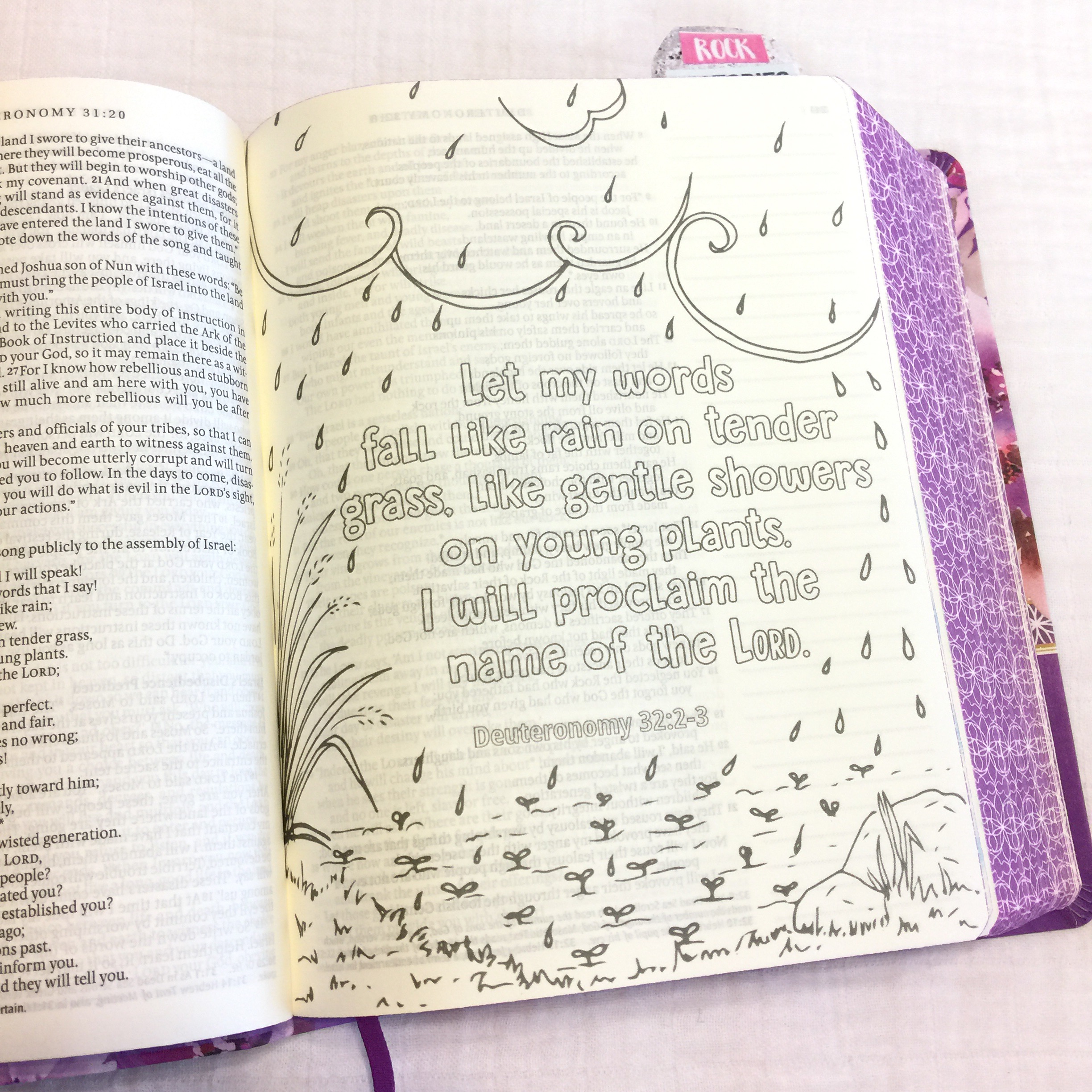 There are new illustrations on the inside covers and the dedication page. Again it was left blank like in the Inspire Praise bible to make it easier to personalize as you choose. This was the first page I illustrated in my new Bible the day after I received it. I used sparkle gel pens and Faber Castell big brush pens to color and write on the spread.