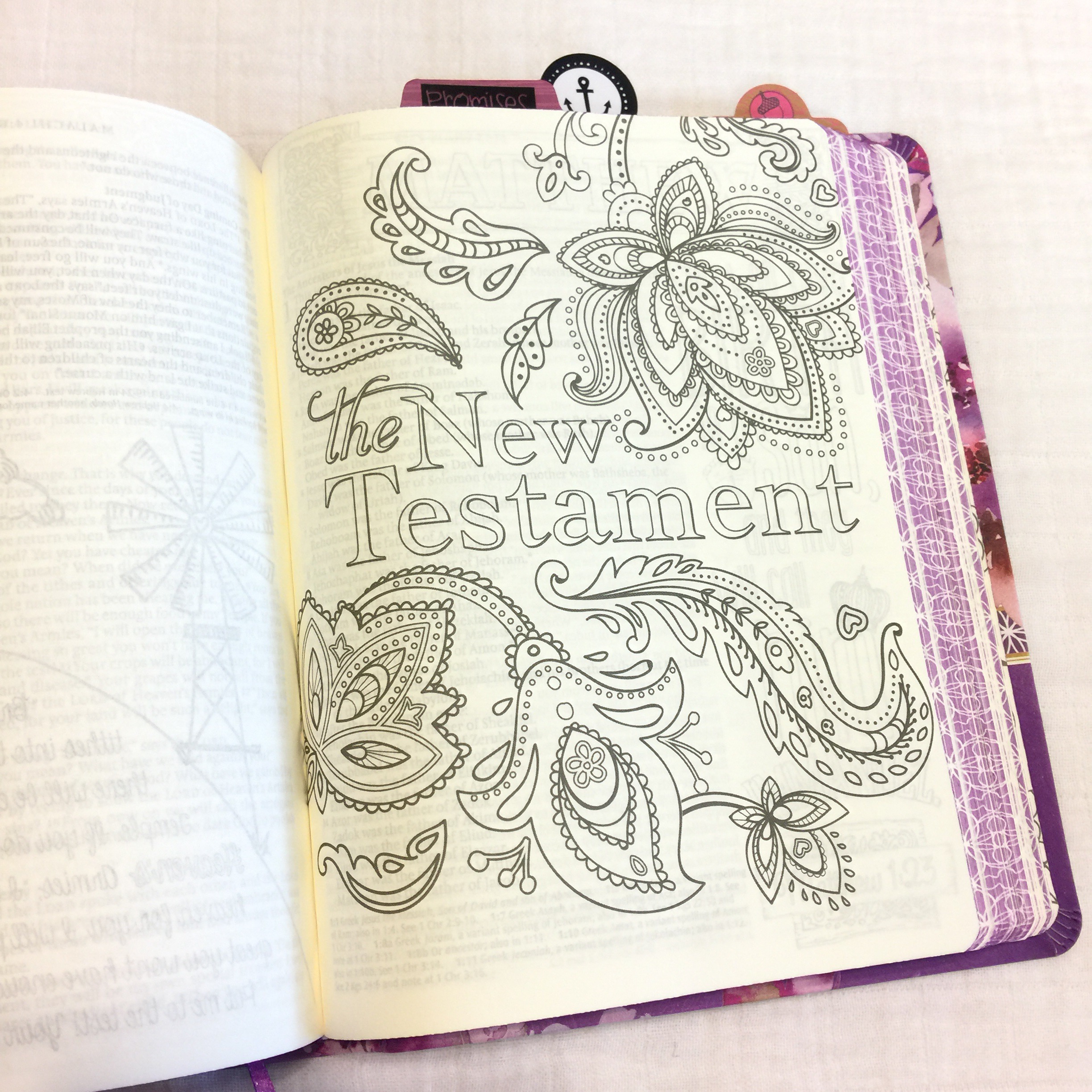 Another new feature of the Inspire Praise is the 4-page welcome message at the beginning of the Bible that invites the reader to praise God through the reading and coloring of this Bible. This would be a great place to start if you are new to Bible journaling and hesitant to get started, as there are beautiful illustrations alongside the welcome message. It would also be a good place to test out different mediums to see how they perform on the pages if you’re concerned about bleed through.