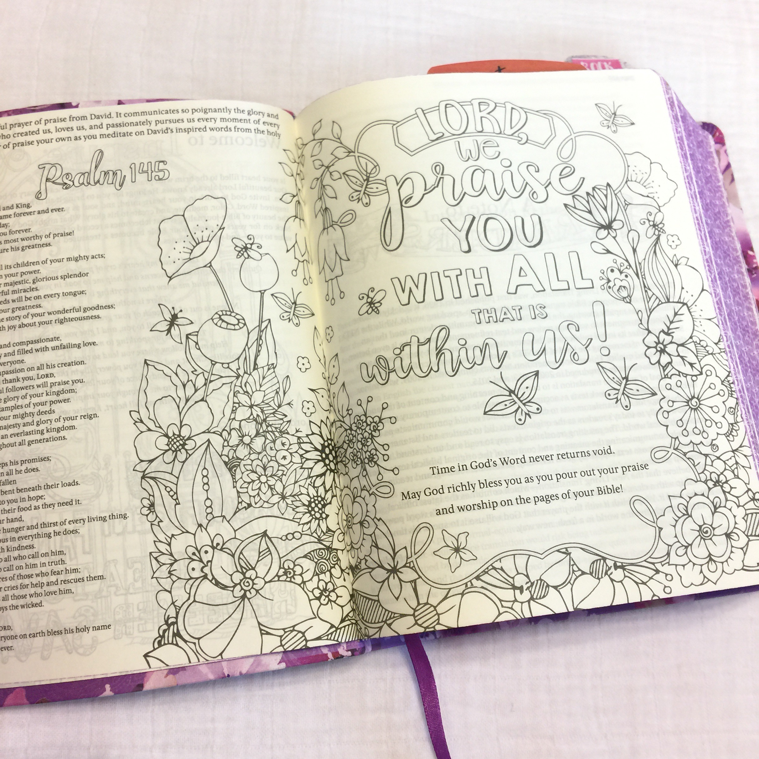 My biggest question when I heard that they were releasing an all-new Bible was will it have the same art or new art? Answer: all new art! And not only that, the Inspire Praise has new features as well. Here is the description from the publisher: “The new Inspire PRAISE Bible has even more beautiful line-art illustrations to color, with nearly 500 all-new full- and partial-page Scripture illustrations attractively displayed throughout the Bible! Bonus features of Inspire PRAISE include even thicker Bible paper; thirty-two colorful, transparent, praise-themed journaling pages to enhance your coloring and creative journaling journey through the Bible; plus, three sheets of PRAISE-themed stickers and a purple pocket in the back of the Bible for storing journaling embellishments. Leave traces of faith―and PRAISE―throughout the Bible for a treasure that will truly inspire! The lightly-ruled, two-inch-wide margins offer additional space to write notes and reflections or to draw and create. The 8.65-point font is larger than most full-size journaling Bibles, and the high-quality Bible paper makes it a great choice for creatively responding to God’s Word right on the pages of the Bible.“
