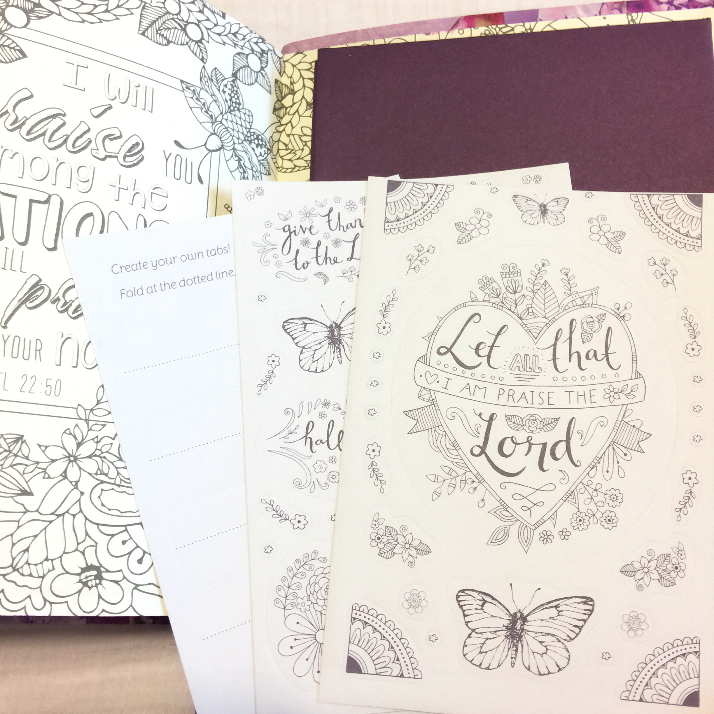 On the back inside cover is a purple pocket containing 3 sticker sheets that you can color and add to your pages. These match the illustration style of the Inspire Praise. One of the sheets is blank tabs that you can color and/or write on and then fold over as you adhere them to the top or side of your page. The pocket can also be used to store a few smaller supplies that you might want to keep and carry along with your bible.