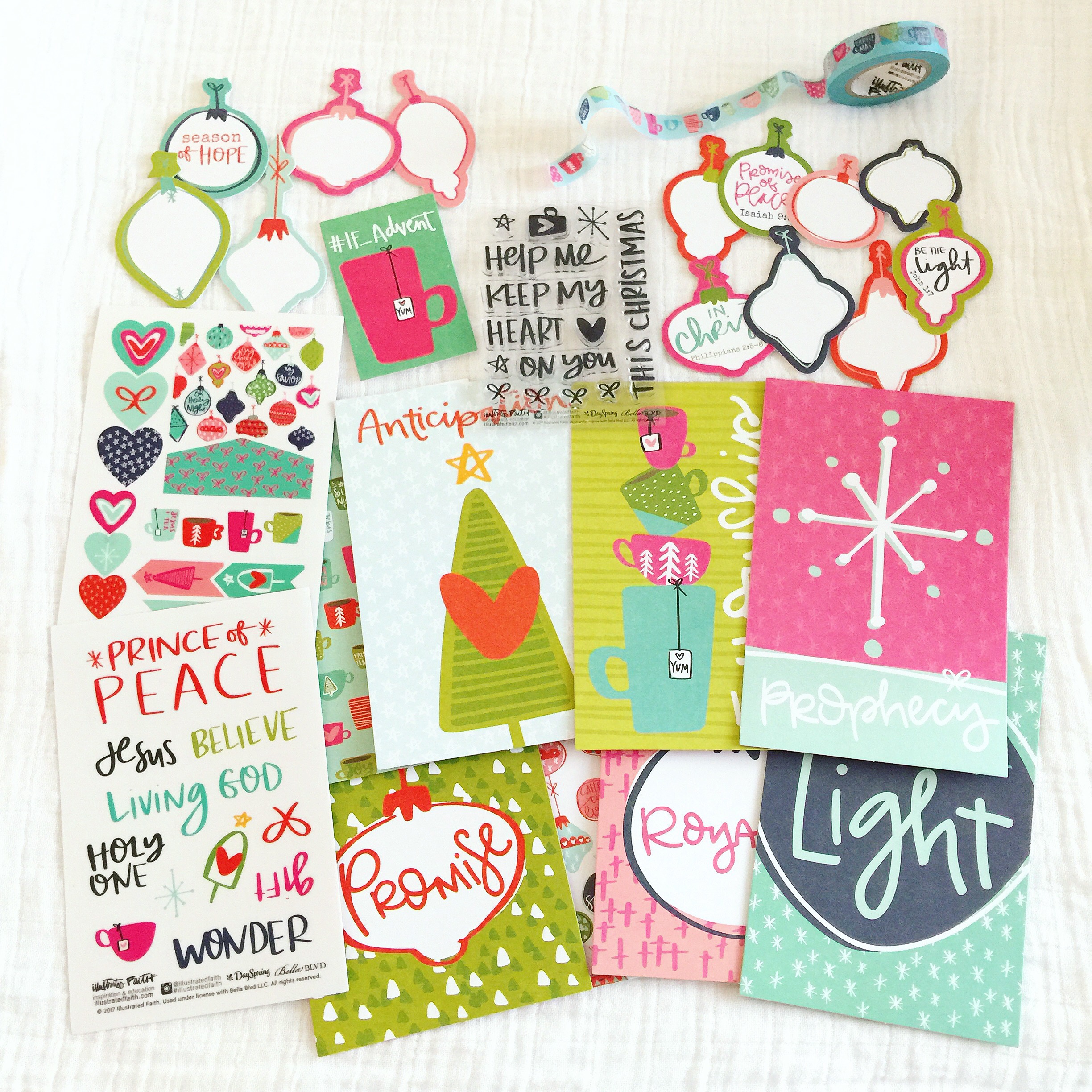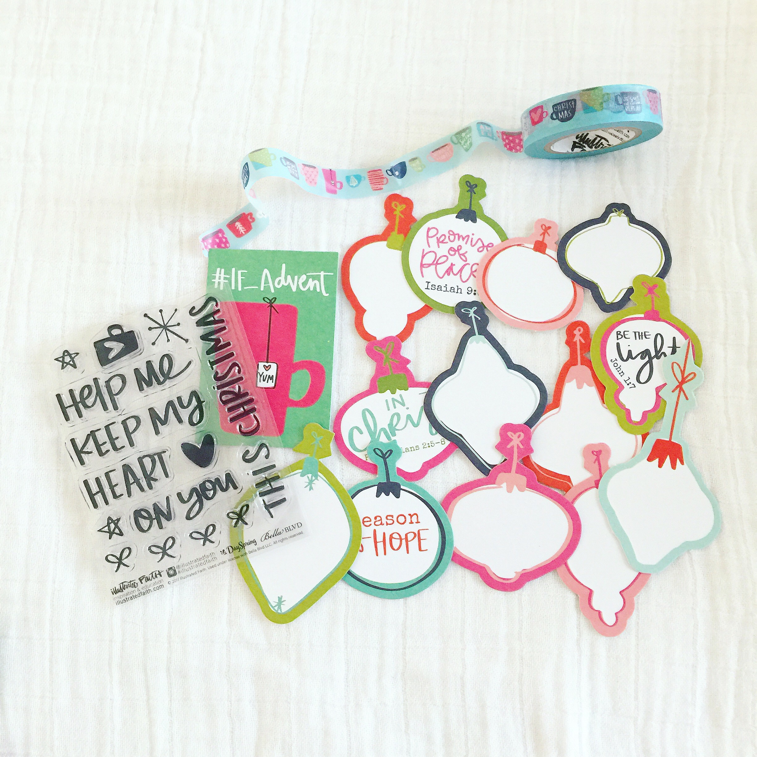 I’m happy to see that the stamp set has more smaller stamps this month to give you more options for stamping cuteness onto your page. However as with past months, I just wish there was more variety. There are two stars and 4 bows, so I would have liked to see maybe a little tree or a little ornament. But the great thing about the Advent kit is that it coordinates with the entire line of Illustrated Faith Advent products on Dayspring, and there is a stand-alone Advent stamp set with more stamps that would be a great add-on to use with this kit. The die cut pieces are a mix of blank vintage style ornaments and a few ornaments with words on them. It would be so cute to use some of the icons from the stamp set to embellish the blank ornaments.