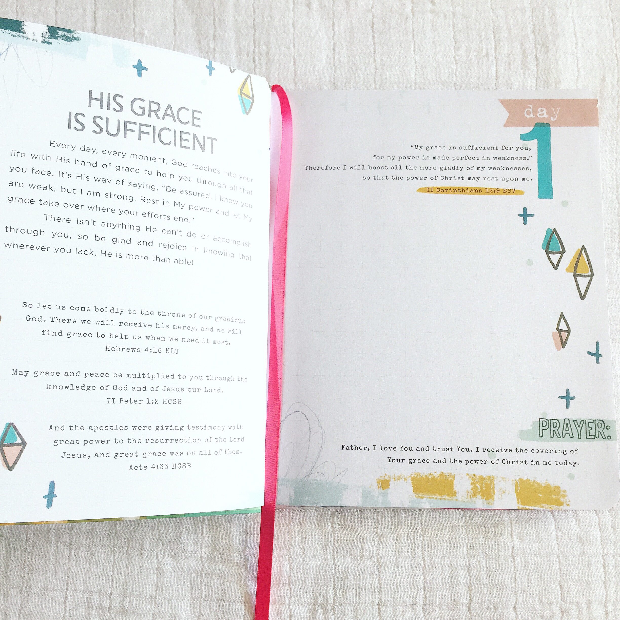The pages themselves are nice thick paper to allow for less possibility of bleed thru. The book itself doesn’t lay flat without a lot of bending and coaxing, so that’s the only drawback that I’ve found with the physical book itself. The size is very portable, making it easy to slip into a bag while on the go. The cover is a flexible latex board with a matte finish and the binding is a notebook binding. As a bonus to go with the book when you purchase through Dayspring, you receive an email with a free 3-page downloadable printable that coordinates with the art in the book to use with your journaling.