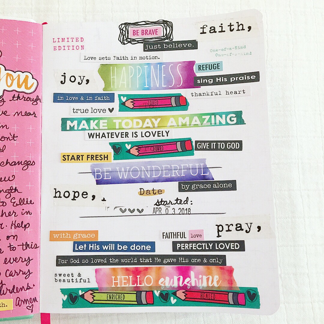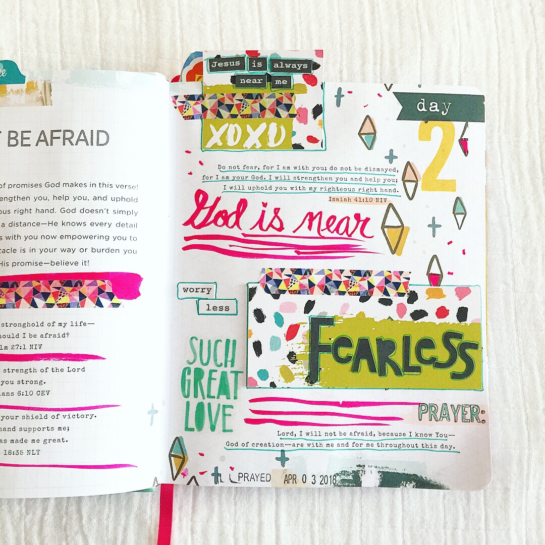 For Day 2, I used my Jane Davenport Mermaid Markers to add some hot pink to the page to match the ribbon bookmark that comes attached to the book. These did bleed a little, so I still had to use a light hand with these paint brushes, but at least they didn’t bleed as badly as when I’ve used them in my Bible. I added a few stickers, and then cut apart a tip-in to create a tab and place for hidden journaling. The promise that really stuck out to me on this page was that Jesus is always near me, so I can worry less and be fearless.