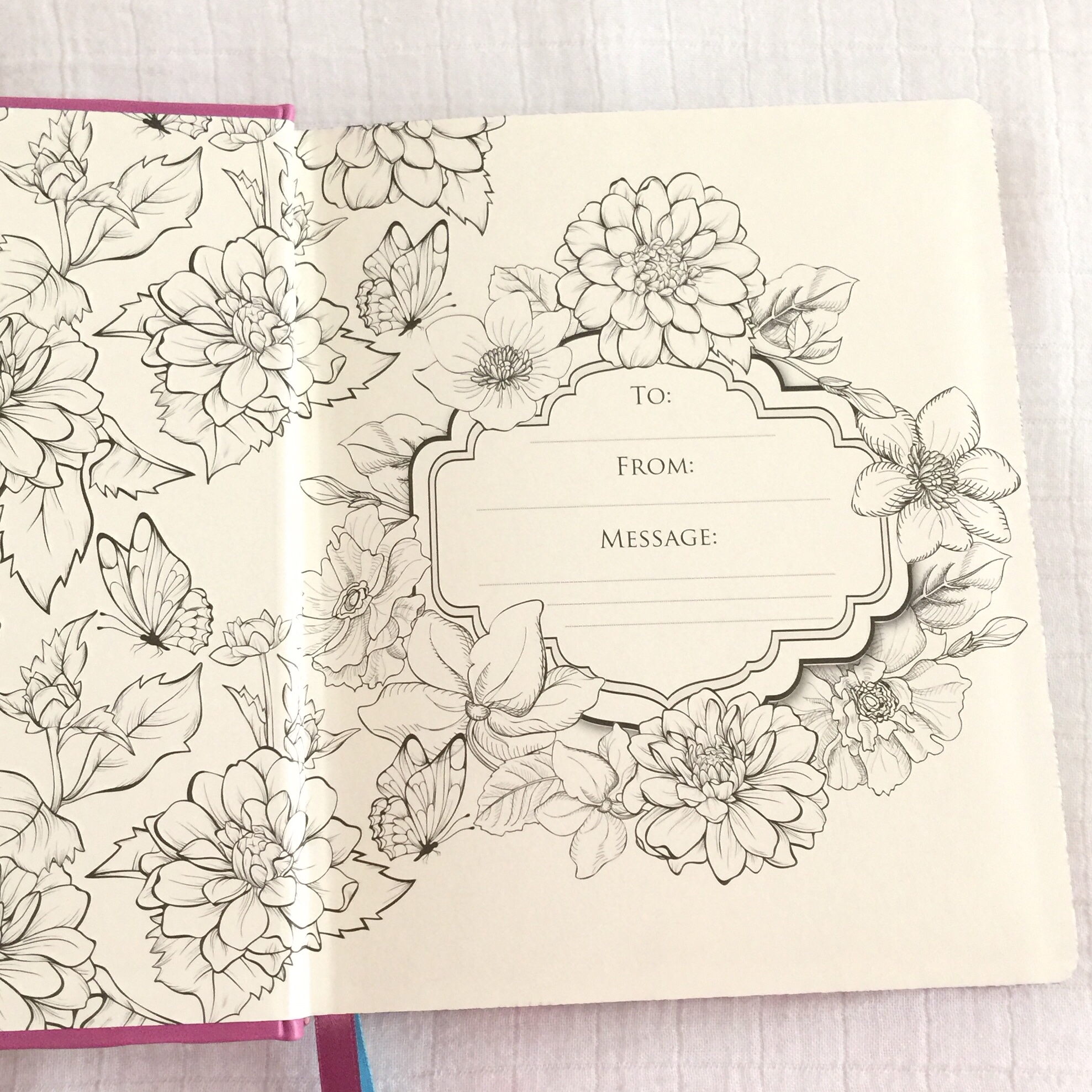 The illustrations on the inside front and back cover are unique to this Bible, and the presentation page is absolutely beautiful! It would make a lovely gift for your mom or wife to color the presentation page and write a note to her. This would also be a great place to let children or grandchildren color for mom or grandma, creating a personal and special gift that she will cherish.
