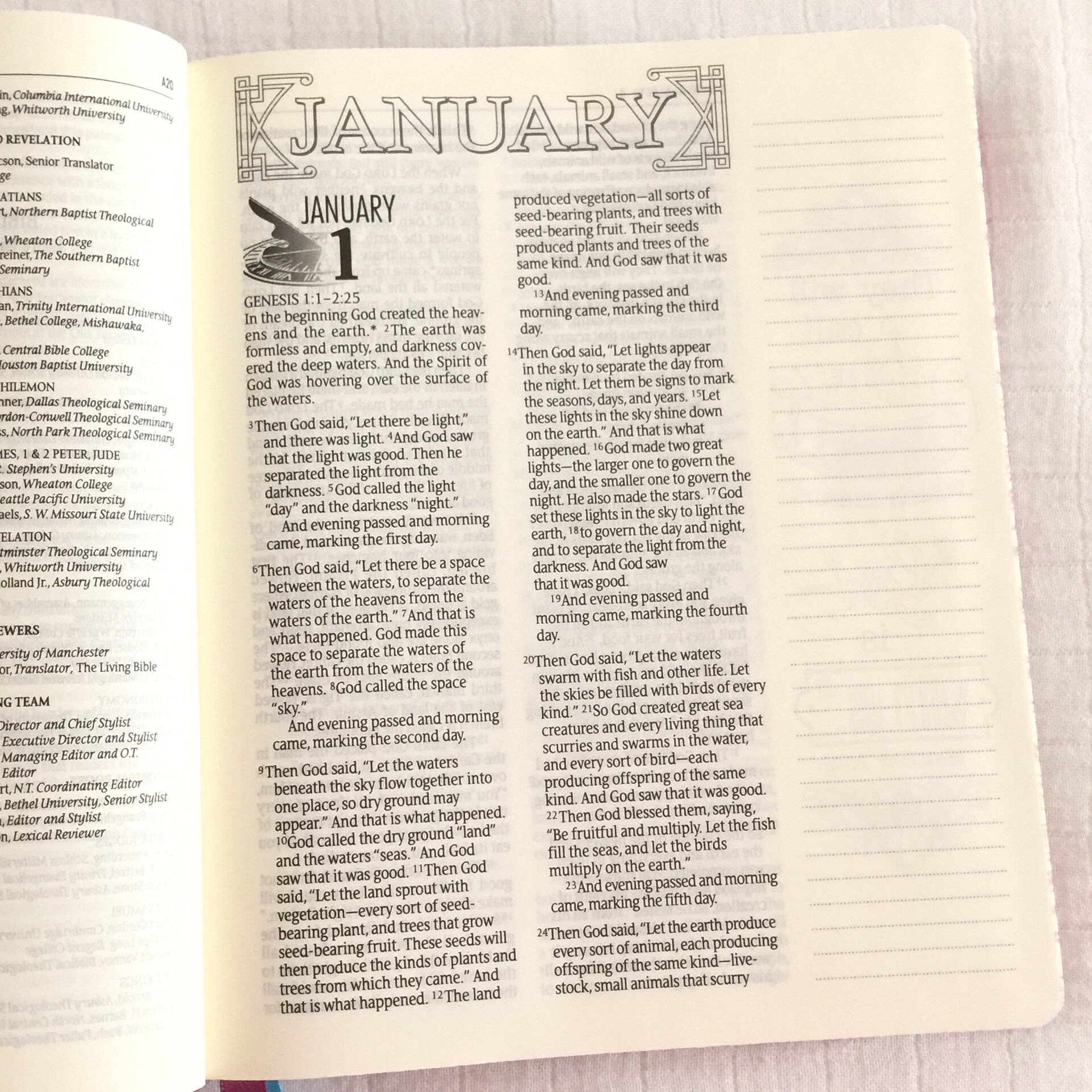 What is a One Year Bible though? It’s a Bible that has the entire New Living Translation text divided into 365 daily readings that include a passage from the Old Testament, the New Testament, Psalms, and Proverbs. By organizing the text in this way, it helps guide the reader through the entire Bible in one year in a format that is more conducive to a busy life, or for those who need the visual ease of having it organized this way instead of having to flip all over the place with a traditional bible and reading plan. Each section is dated from January 1st through December 31st.