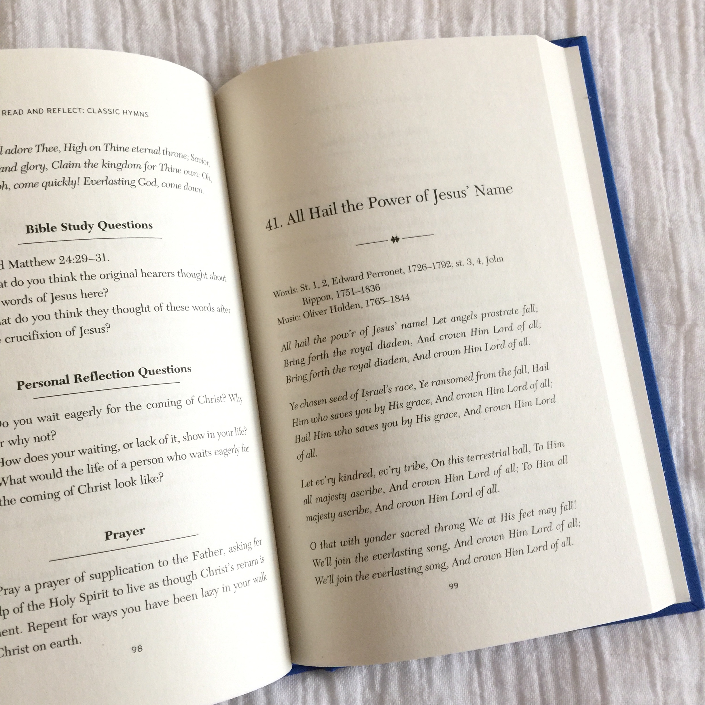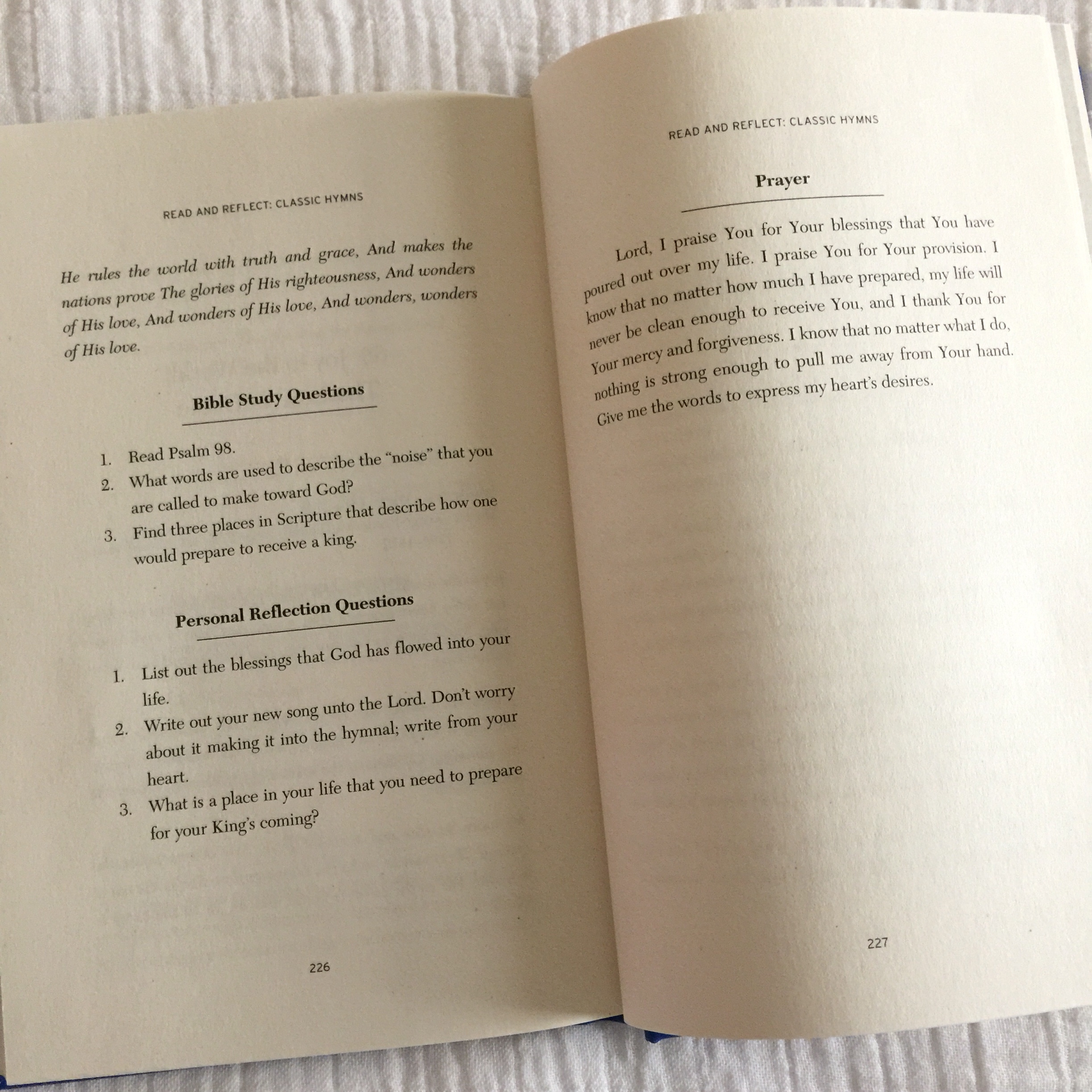 The book includes 90 traditional hymns, including several Christmas hymns at the end of the book. Each chapter is just a few short pages and includes the full text of the hymn, Bible study questions with a suggested passage to read, personal reflection questions, and a prayer suggestion/topic as promoted by the hymn. I would consider the text of this book to be more of a devotional, since it doesn’t really include historical information about the hymns themselves other than the songwriter(s) and the year it was written.