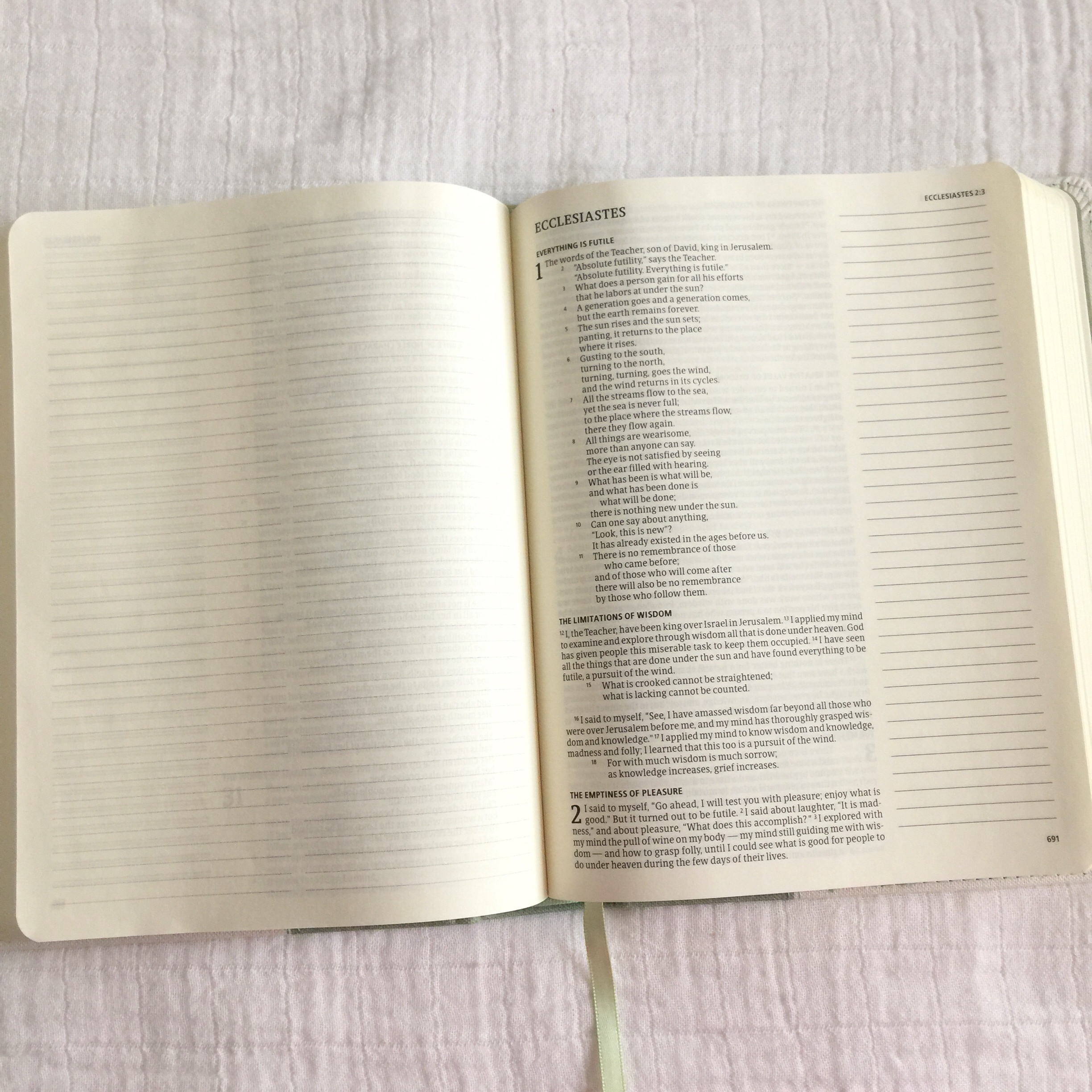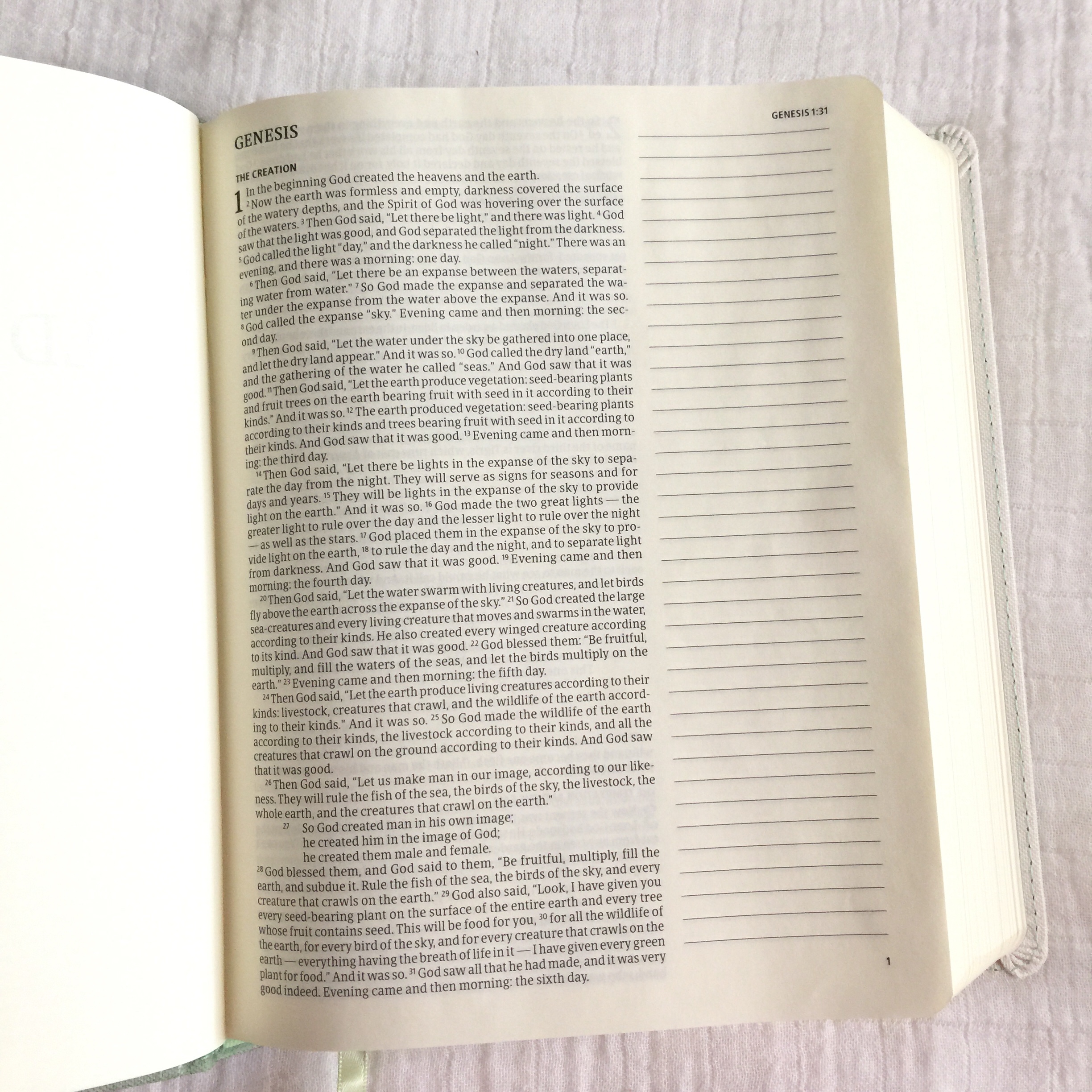 Overall I am very pleased with this Bible and would highly recommend it to those wanting a Bible for taking notes and written journaling. For those wanting to art worship in this Bible, I would just keep in mind whether the dark margin lines would be too distracting for you or not. For me personally it’s not a deal breaker, and I will happily continue to use this Bible for art worship.