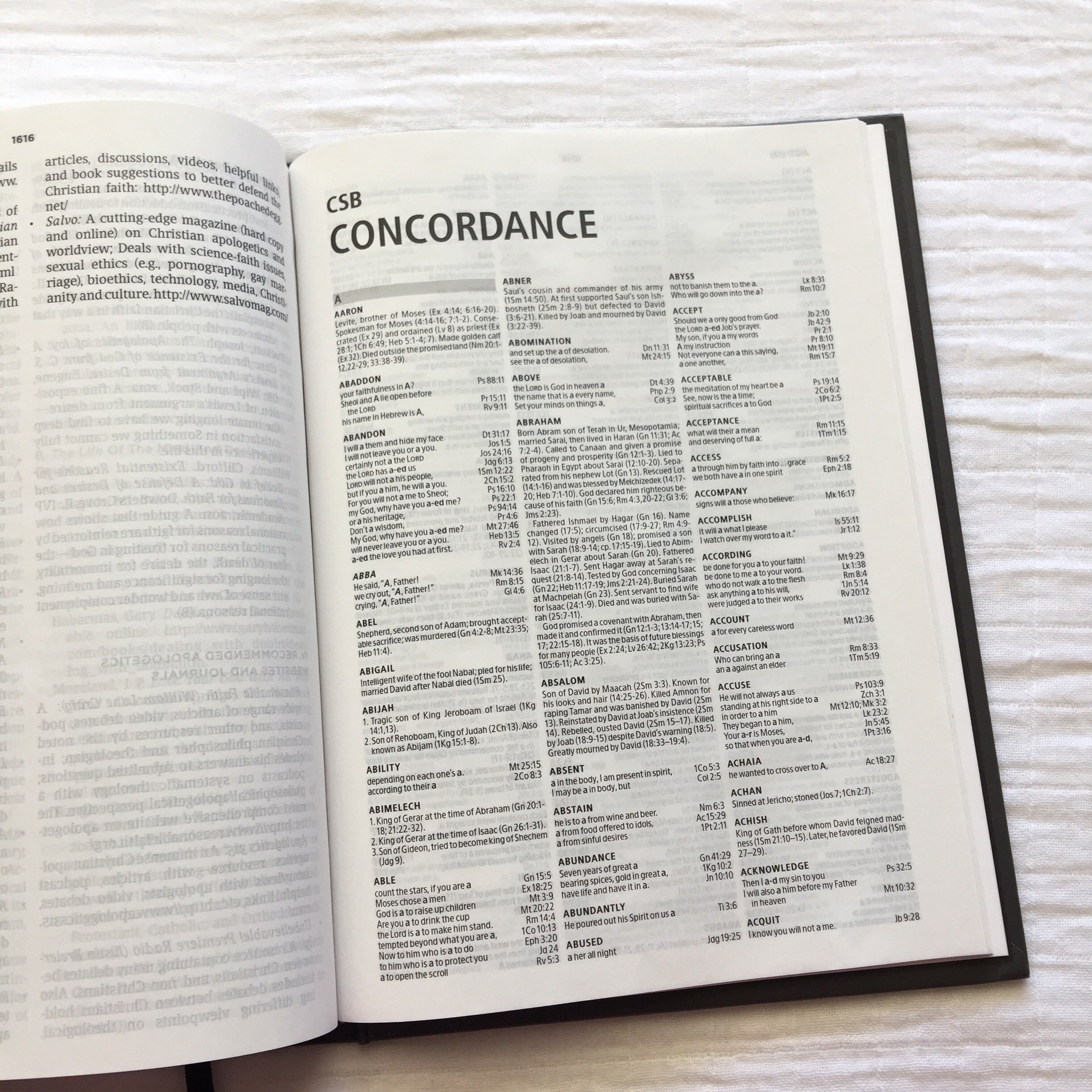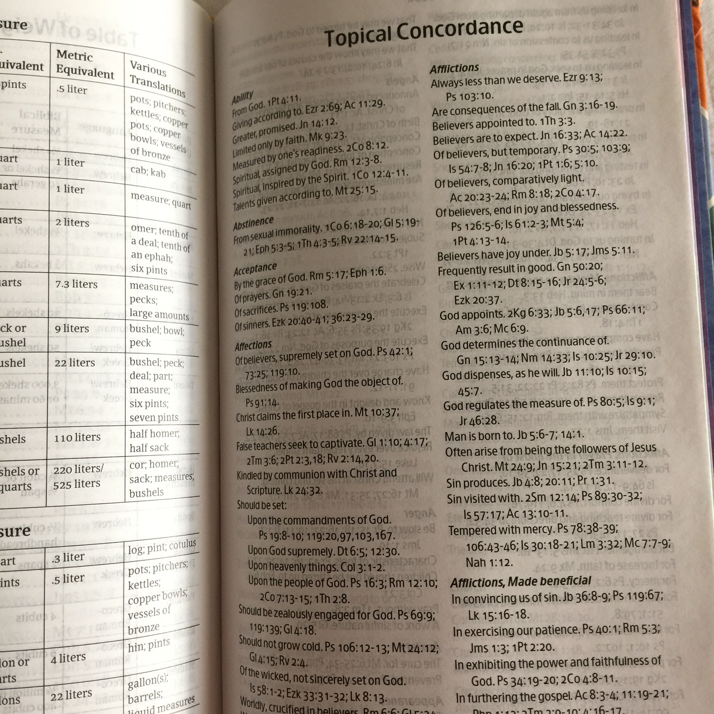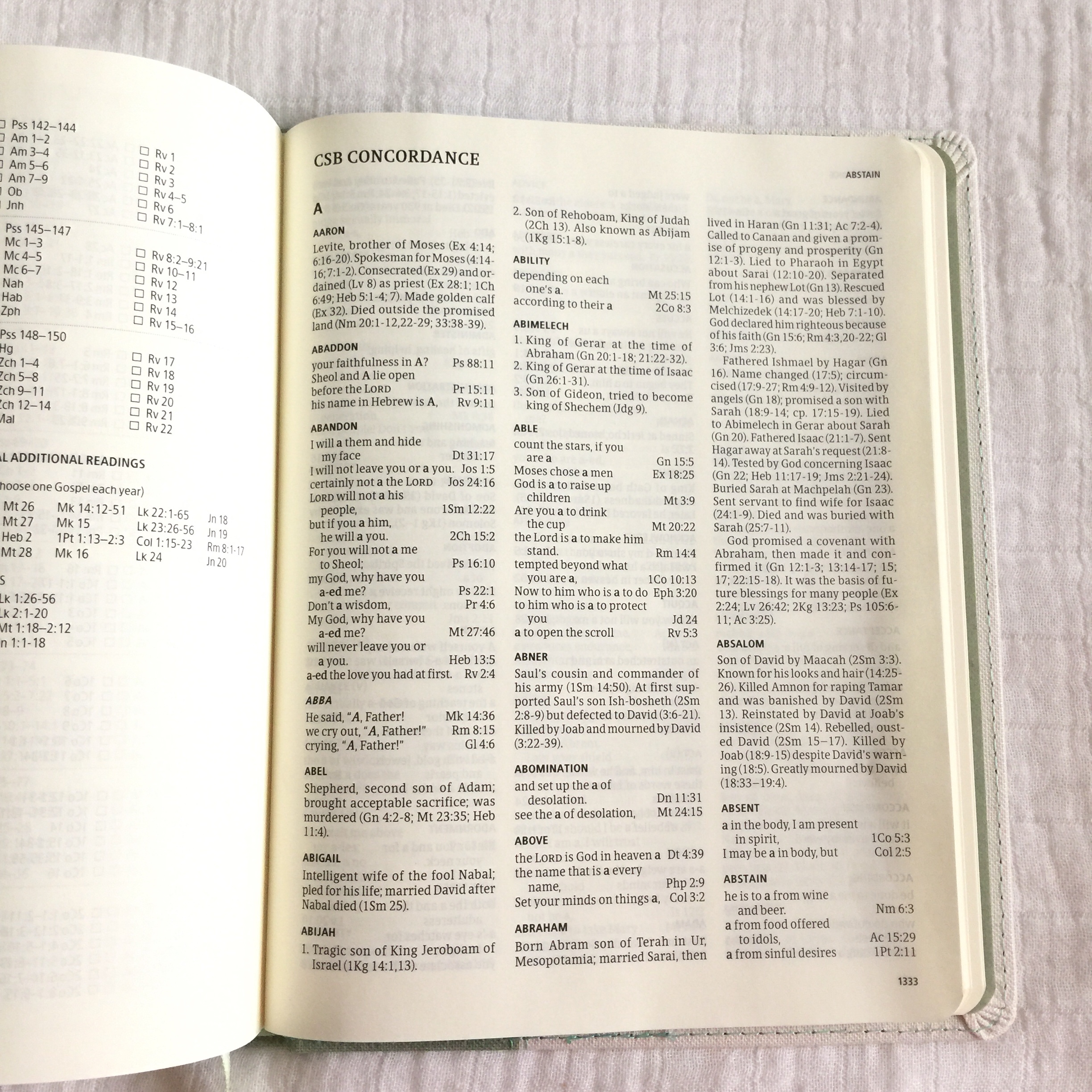 Another great feature of this Bible is the sizable concordance in the back. It’s one of the biggest and most comprehensive I’ve seen in a journaling Bible, making it a great resource for those wanting to study certain topics or cross-reference different verses. There aren’t any footnotes in the Bible text itself, so this added feature is helpful for doing more in-depth personal study.