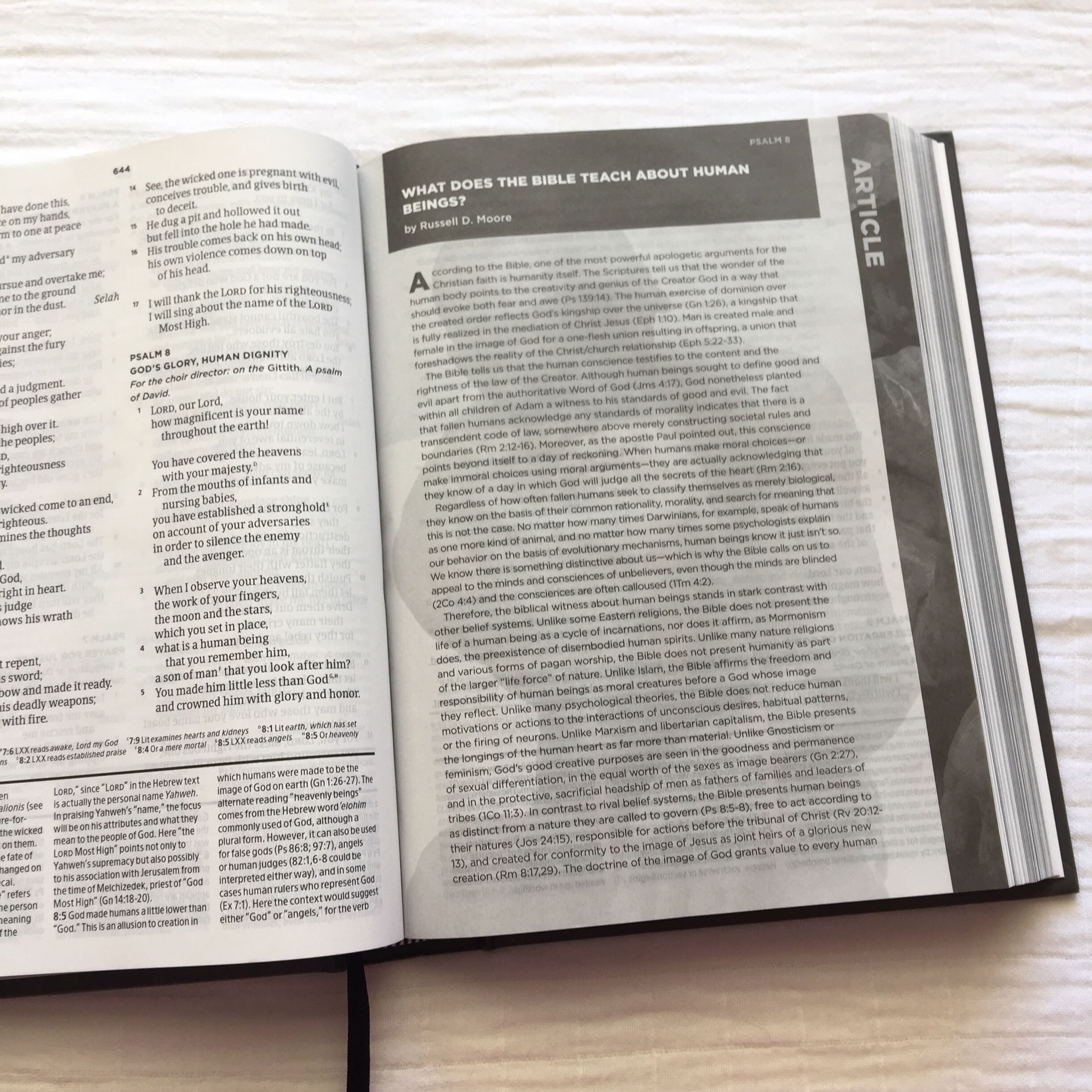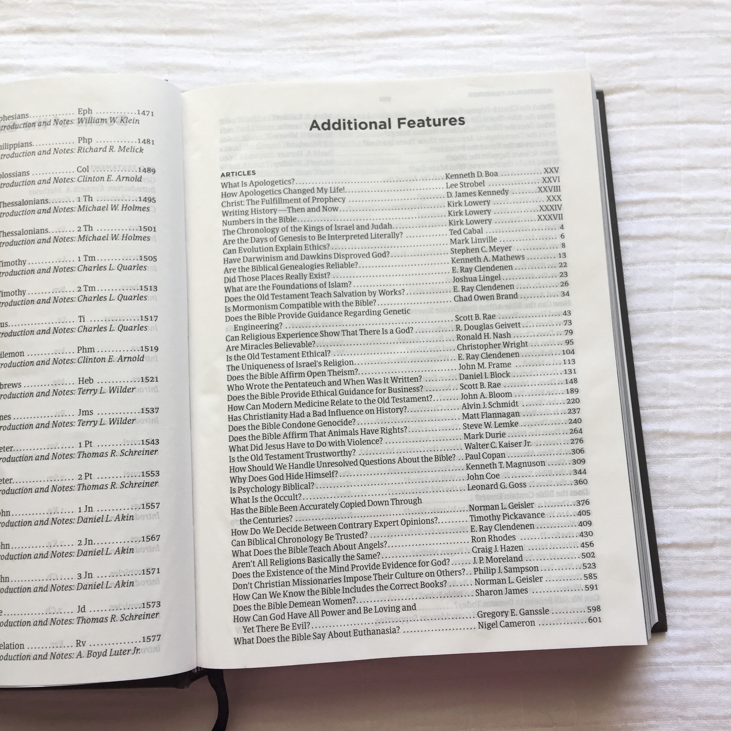 The design of The Apologetics Study Bible is clean and simple, creating a distraction-free reading experience. I will say that due to the content of some of the articles, it can get a bit academic and feel like reading a textbook. However, this doesn’t bother me as I enjoyed reading textbooks in college, but I wanted to mention that these are not light, fluffy articles. I think the hardcover version also adds to the feeling of a textbook, but luckily it’s not so thick that it’s too cumbersome to hold in your lap to read.