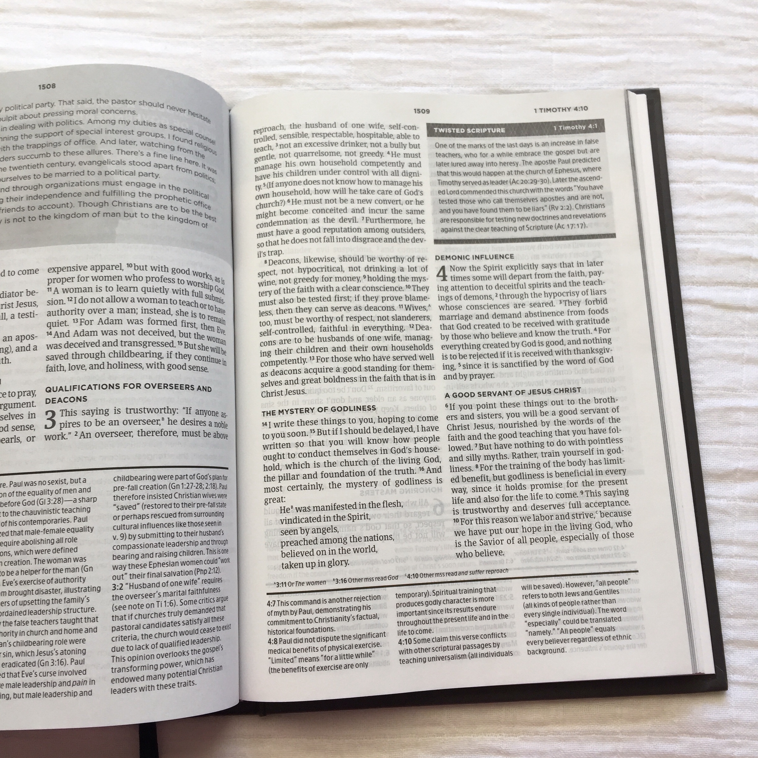 One of my favorite features of this Bible is the clear study notes at the bottom of the pages. These notes help provide insight to historical customs and context, times when a person chose to sin instead of follow God, and the purposes and meanings behind things like genealogy and numbers. Another feature that I enjoyed while reading the text is the “Twisted Scripture” blurbs spread sporadically throughout. These small sections help illuminate ways that certain cultures, religions, or people groups have taken a certain passage of scripture and twisted it to mean something that distorts the original intention.
