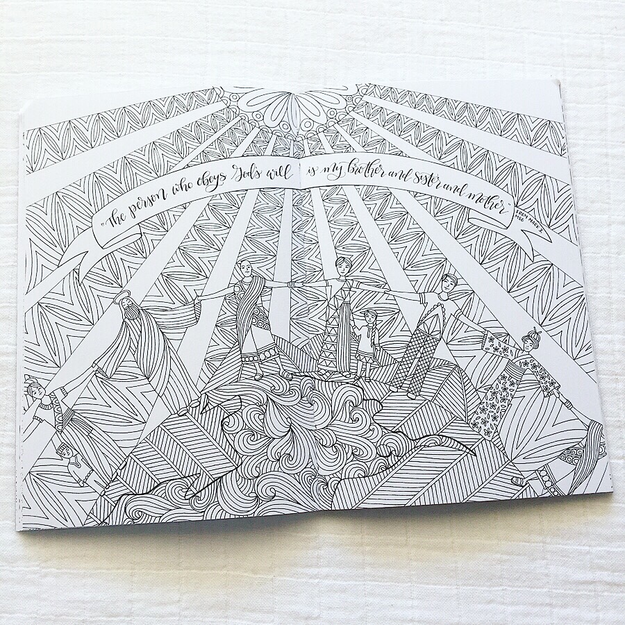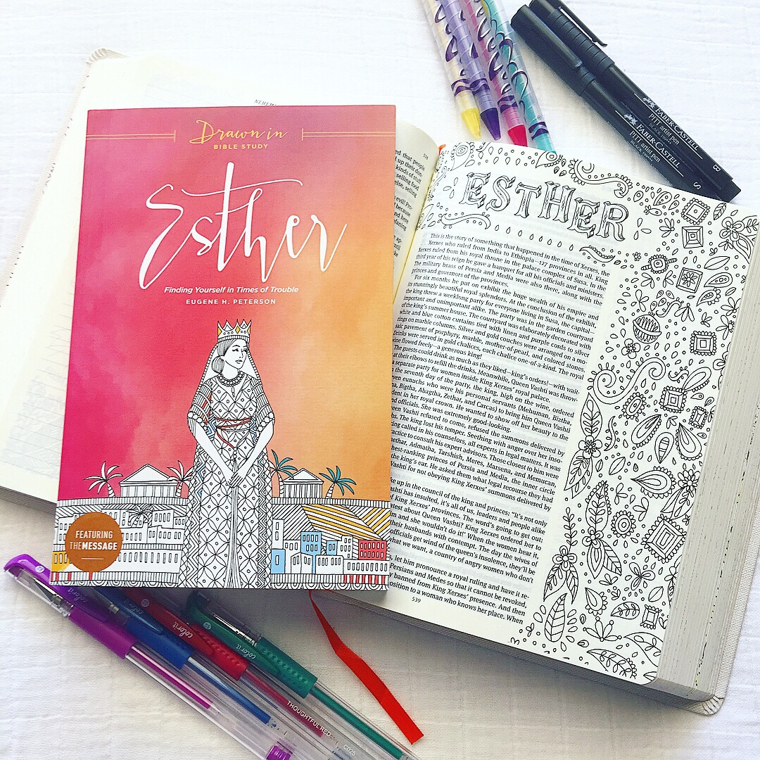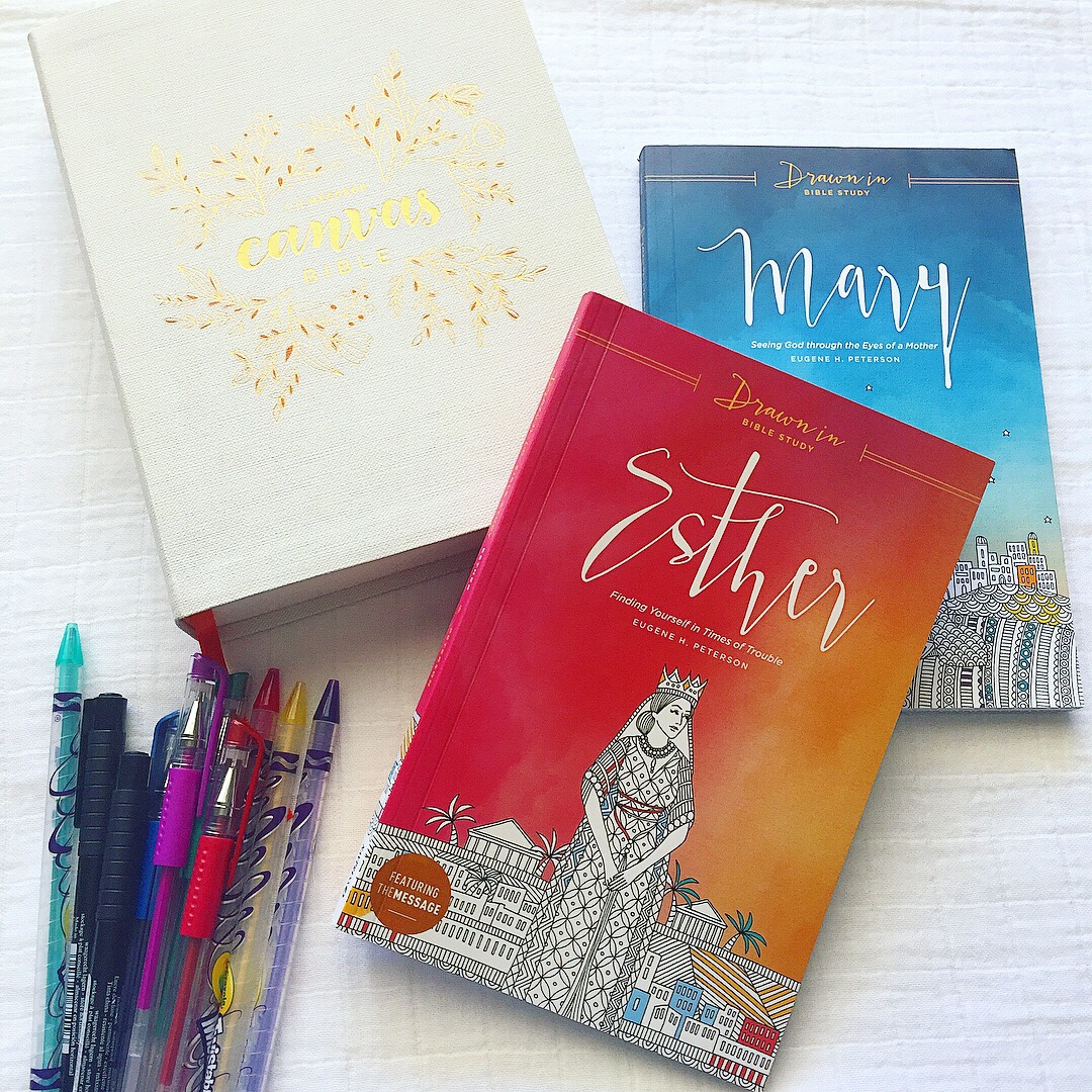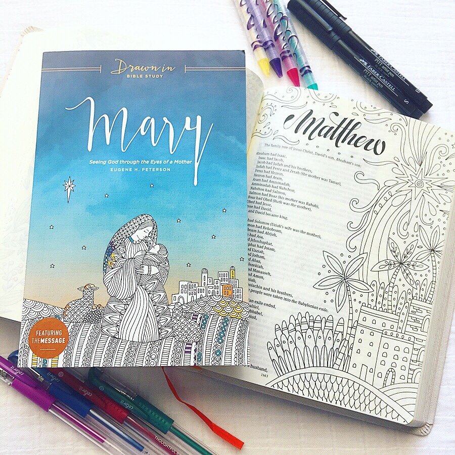 Here is the description of the series from the publisher: “Color with friends. Be drawn into scripture. Deepen your friendships as you gather around Scripture for coloring and conversation. Drawn In offers simple four-week Bible studies―perfect for groups or personal devotions. Coloring quiets your heart and mind so you can enter fully into Scripture’s stories. The Bible’s passion and personality come through in The Message, surprising new and old Bible readers alike. Discover the delight of being Drawn In.”